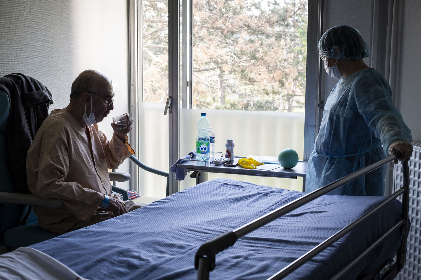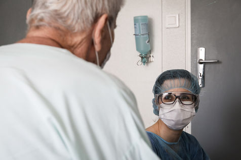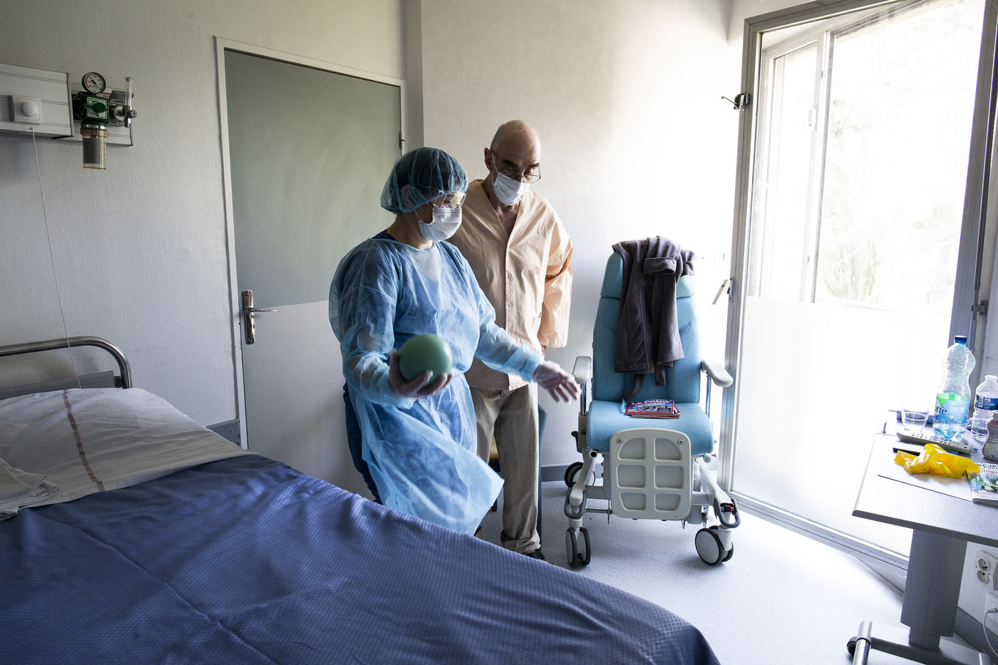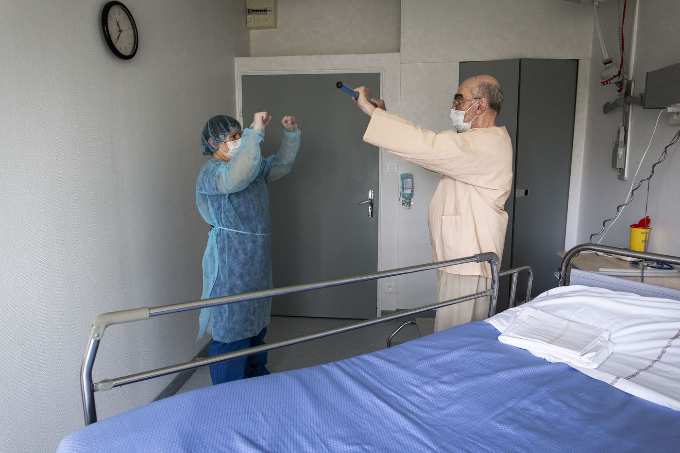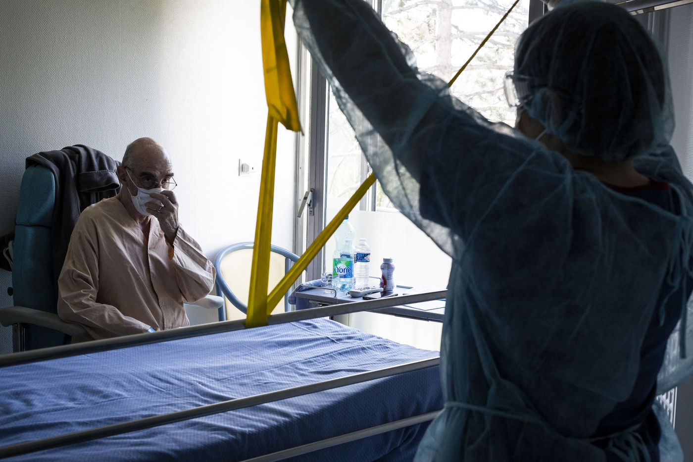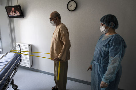 Exercices de kinésithérapie en service de Soins de Suite et Réadaptation (S.S.R) qui aident les patients à retrouver une condition physique pour un retour prochain à domicile. Après l'affaiblissement dû au COVID-19, les patients nécessitent des soins particuliers afin de récupérer une autonomie. Malgrés les gènes respiratoires encore présentes, les progrés sont très rapides. Une surveillance médicale est toujours présente afin d'écarter toute complication ou récidive d'une phase aigüe.