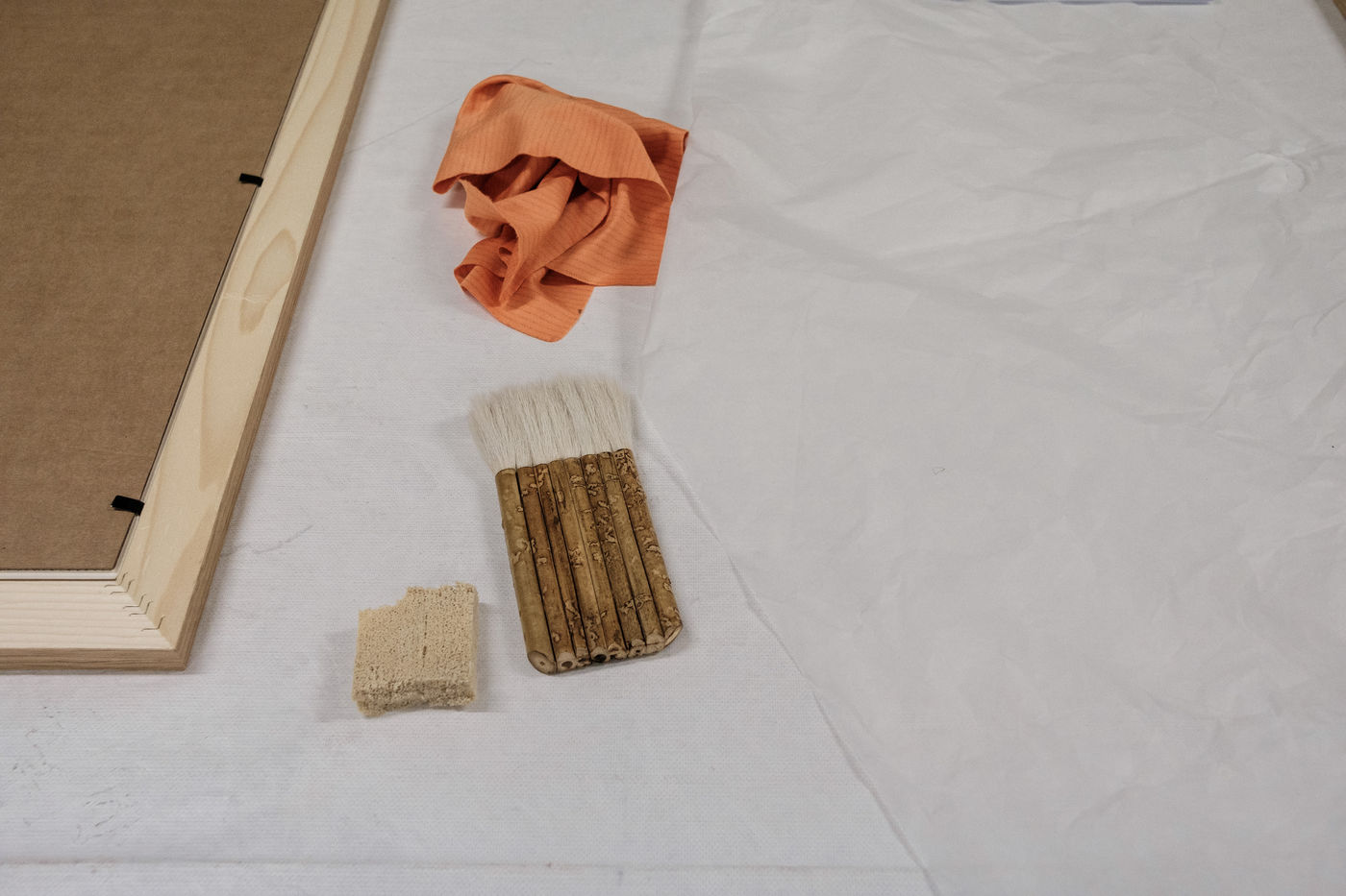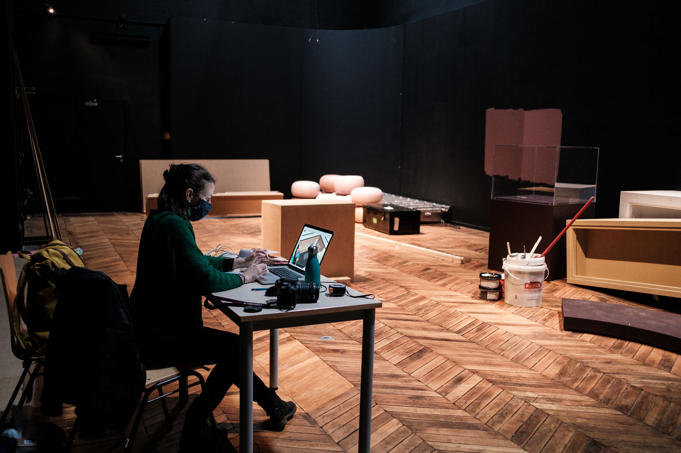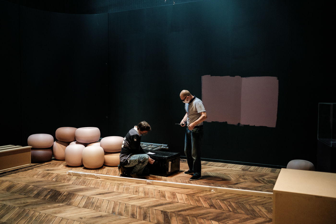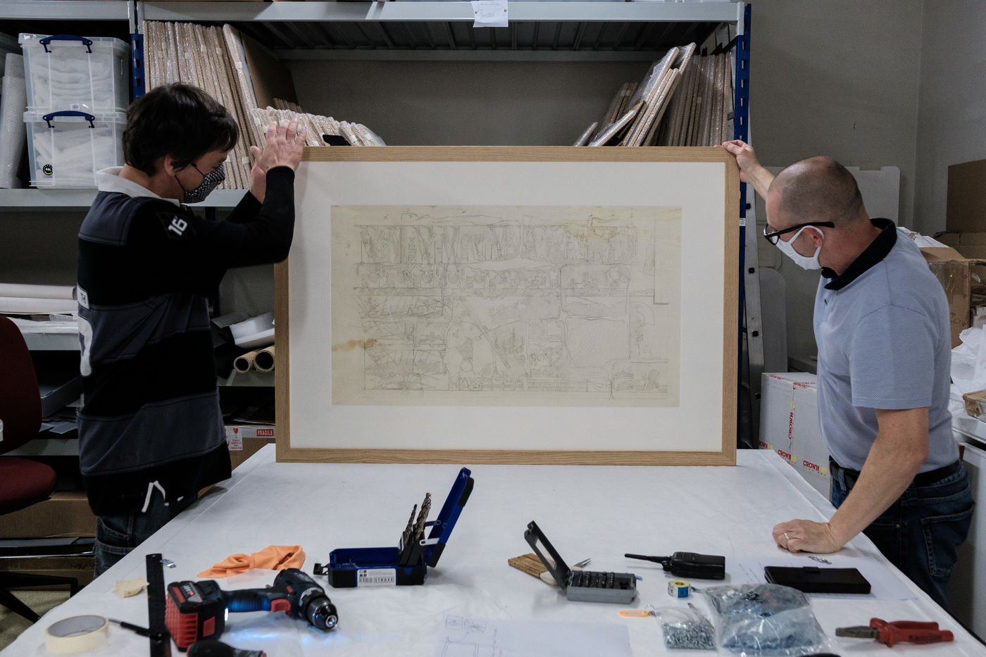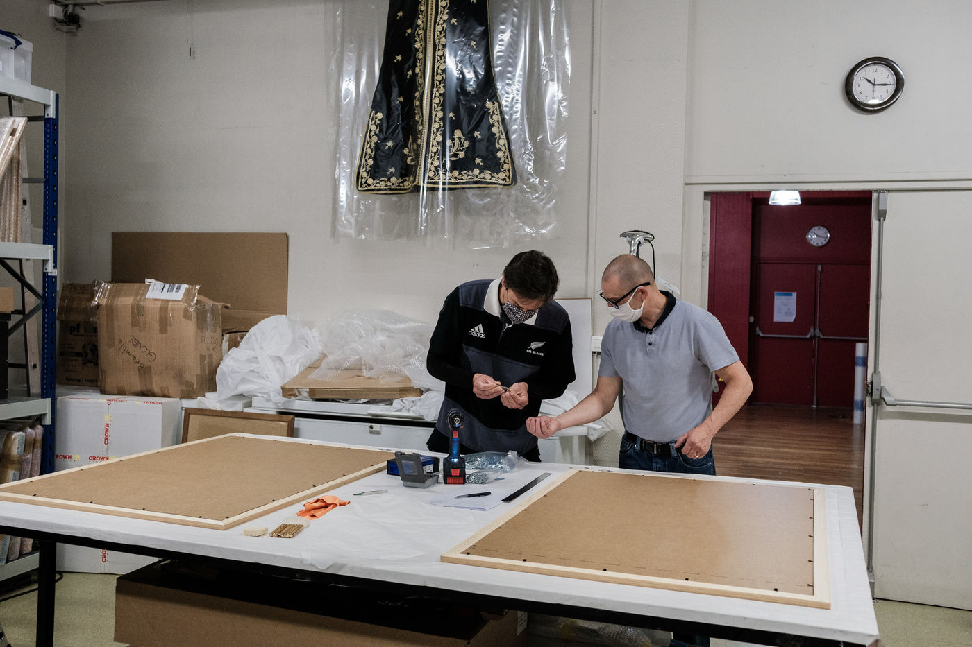 Pour l'heure la mise sous cadre des oeuvres, la scénographie de la salle ainsi que la mise en place des éléments de visite occupent les équipes.