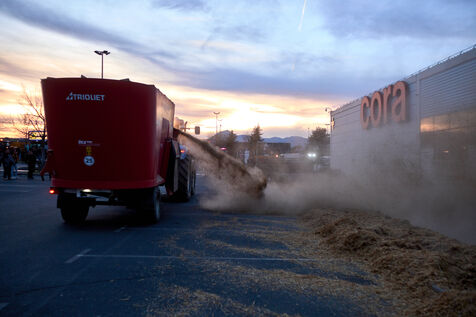 Les actions ciblees des agriculteurs continuent a Clermont Ferrand: soudure du portail d entree de la direction departementale des territoires, deversement de bennes de cendres et facade de grande surface aspergée de lisier et de paille.