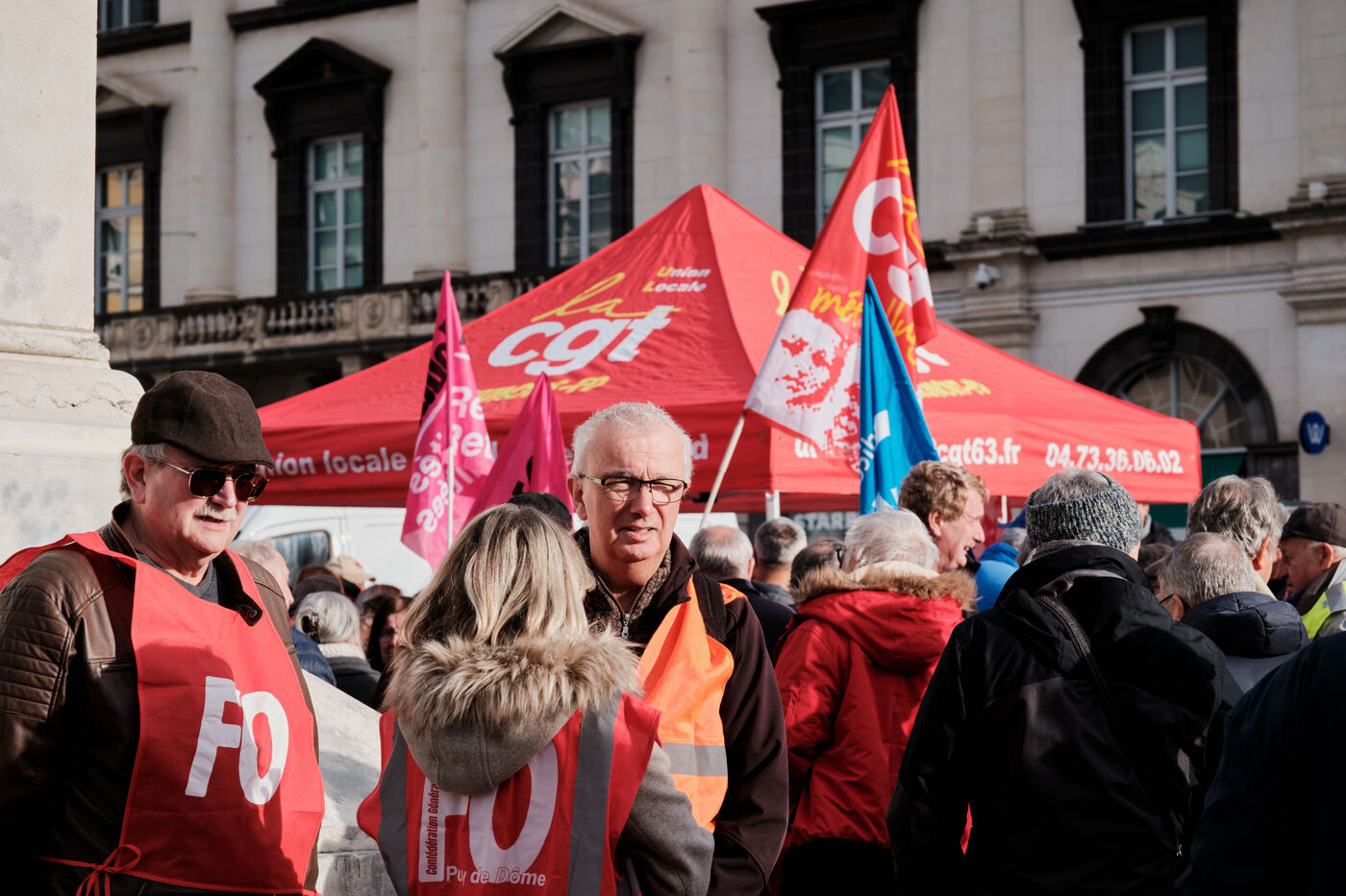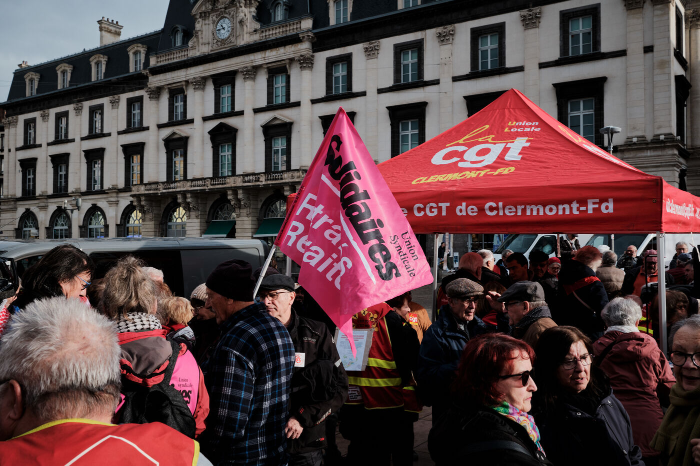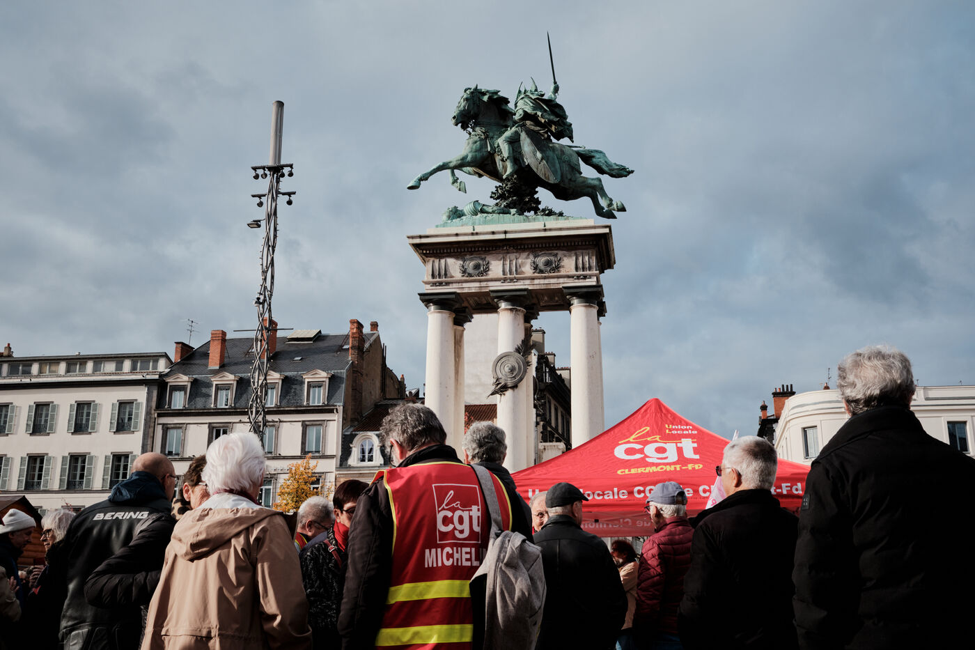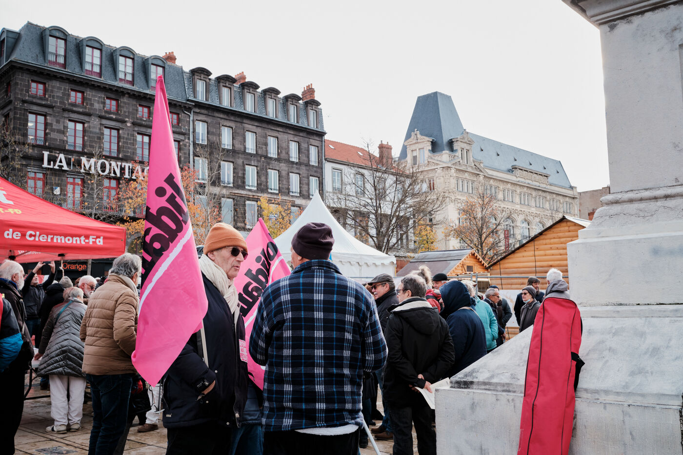 A l appel de 10 organisations syndicales, des retraites du Puy de Dame se sont réunis place de Jaude a Clermont Ferrand. C est a cote du marche de Noel clermontois qu ils se sont réunis pour demander une revalorisation de leurs pensions du montant de l inflation au 01 Janvier 2025. Les retraites exigent aussi le rattrapage des pertes du pouvoir d achat subies depuis 2017 ainsi qu un niveau de pension minimum égal au SMIC.