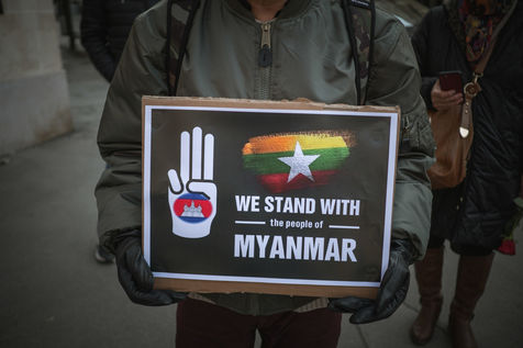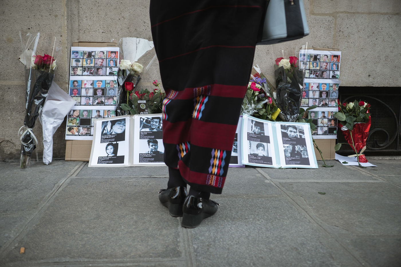 Rassemblement de la communauté Birmane de France à Paris, en oppoistion au coup d'état en Birmanie par la junte militaire. L'ambassadeur du Myanmar rejoint une délégation pour une dépose d'une gerbes de fleurs à l'embassade en hommage aux victimes abatues.
