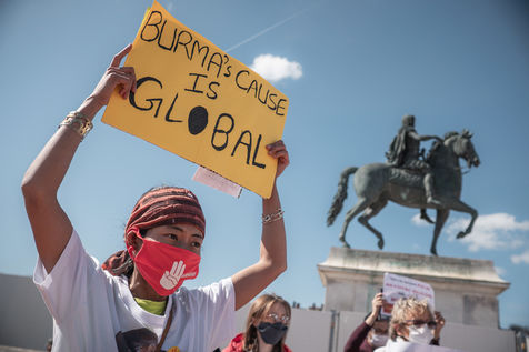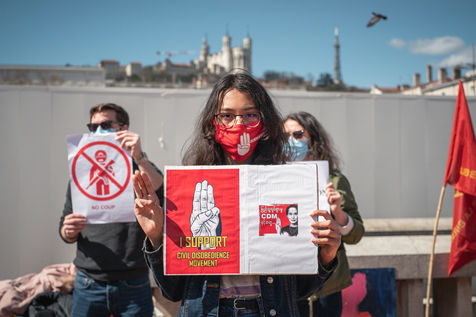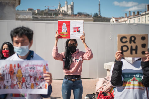 Rassemblement de la communauté Birmane de France à Lyon place Bellecourt, alors qu'à la fin du "Jour de l'armée" au Myanmar, les militaires ont faits plus de 100 morts, dont des enfants, portant le total à plus de 400.