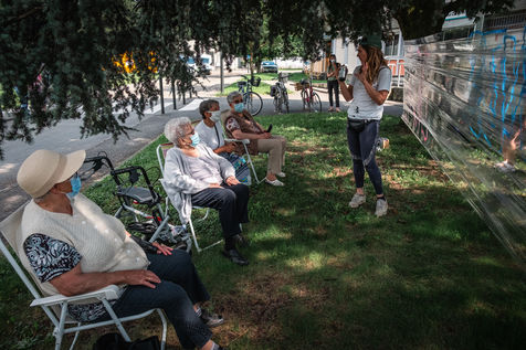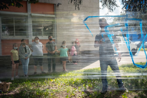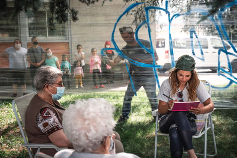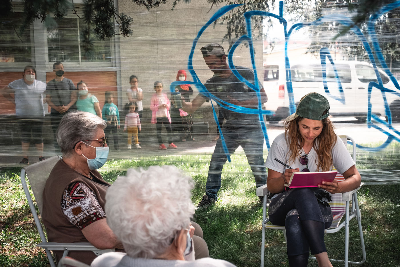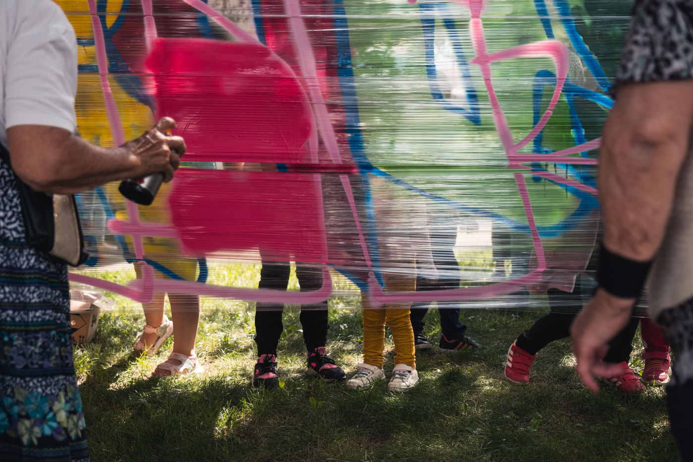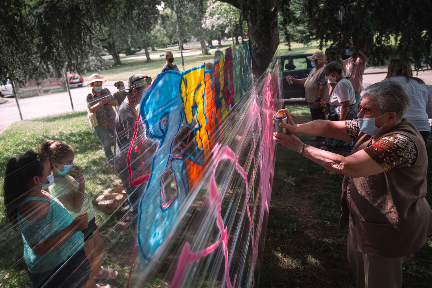 Dans le cadre du Street Art Fest à Grenoble, des personnes agées et des enfants participent à un atelier de découverte du graffiti animé par deux membres d'un collectif de Street Art Grenoblois.