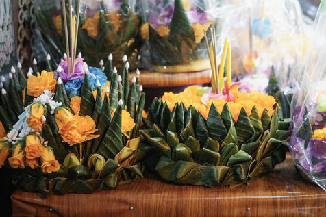 Loy Krathong, un festival organise chaque annee au cours duquel des decorations flottantes et des radeaux de fleurs sont laches sur les rivieres et les etangs le soir de la pleine lune du 12e mois lunaire thailandais.
