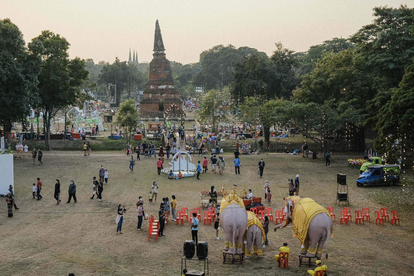 From 17 to 26 December, the entire historic city of Ayutthaya is the scene of an annual festival celebrating the culture and heritage of Thailand and the city. Many Thais gather, in traditional dress or not, in the huge night market set up for the occasion, to watch a sound and light show featuring historical events and elephants.