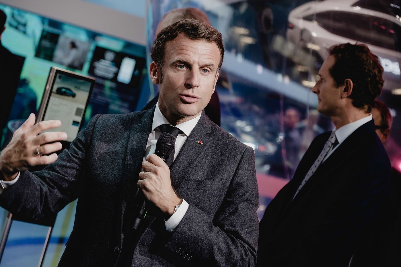 Visite du President Emmanuel Macron et de Bruno Le Maire, Christophe Bechu, Agnes Pannier-Runacher, Roland Lescure, Clement Beaune au mondial de l auto 2022, 1ere edition depuis 2018.. Echange avec les constructeurs et sous-traitants de la filere automobile.