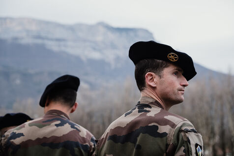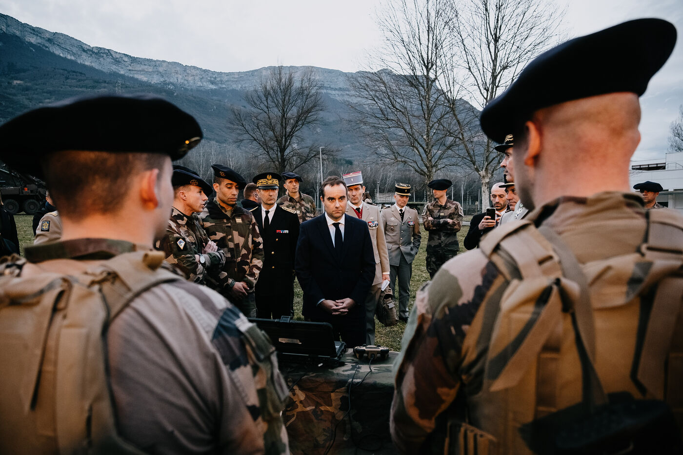 Visite de Sebastien Lecornu, ministre des armees au 93e regiment d'artillerie de montagne, qui fete ses 100 ans en 2024, en banlieue de Grenoble. Presentation des capacites d'artillerie dont des canons Caesar, dans le cadre de la formation des forces armees Ukrainiennes.