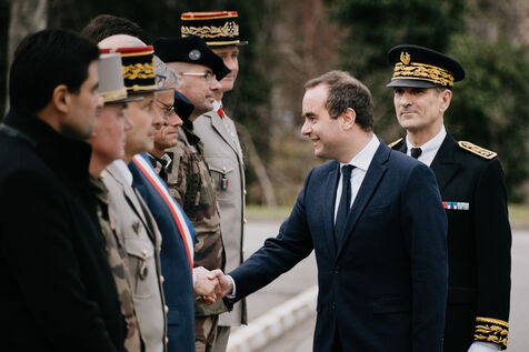 Visit by Sebastien Lecornu, Minister for the Armed Forces, to the 93rd mountain artillery regiment, which celebrates its 100th anniversary in 2024, on the outskirts of Grenoble. Presentation of artillery capabilities, including Caesar guns, as part of the training of the Ukrainian armed forces.