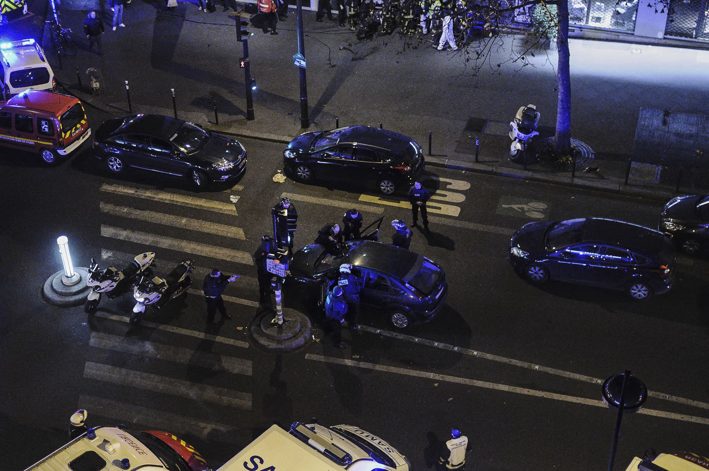 Sur le Boulevard de Filles du Calvaire, deuxième surprise: des centaines de voitures de policiers et de sapeurs-pompiers sont stationnées en attente.
