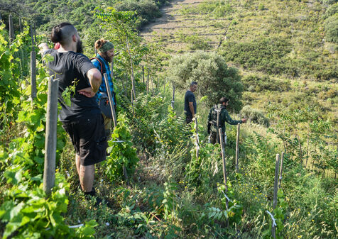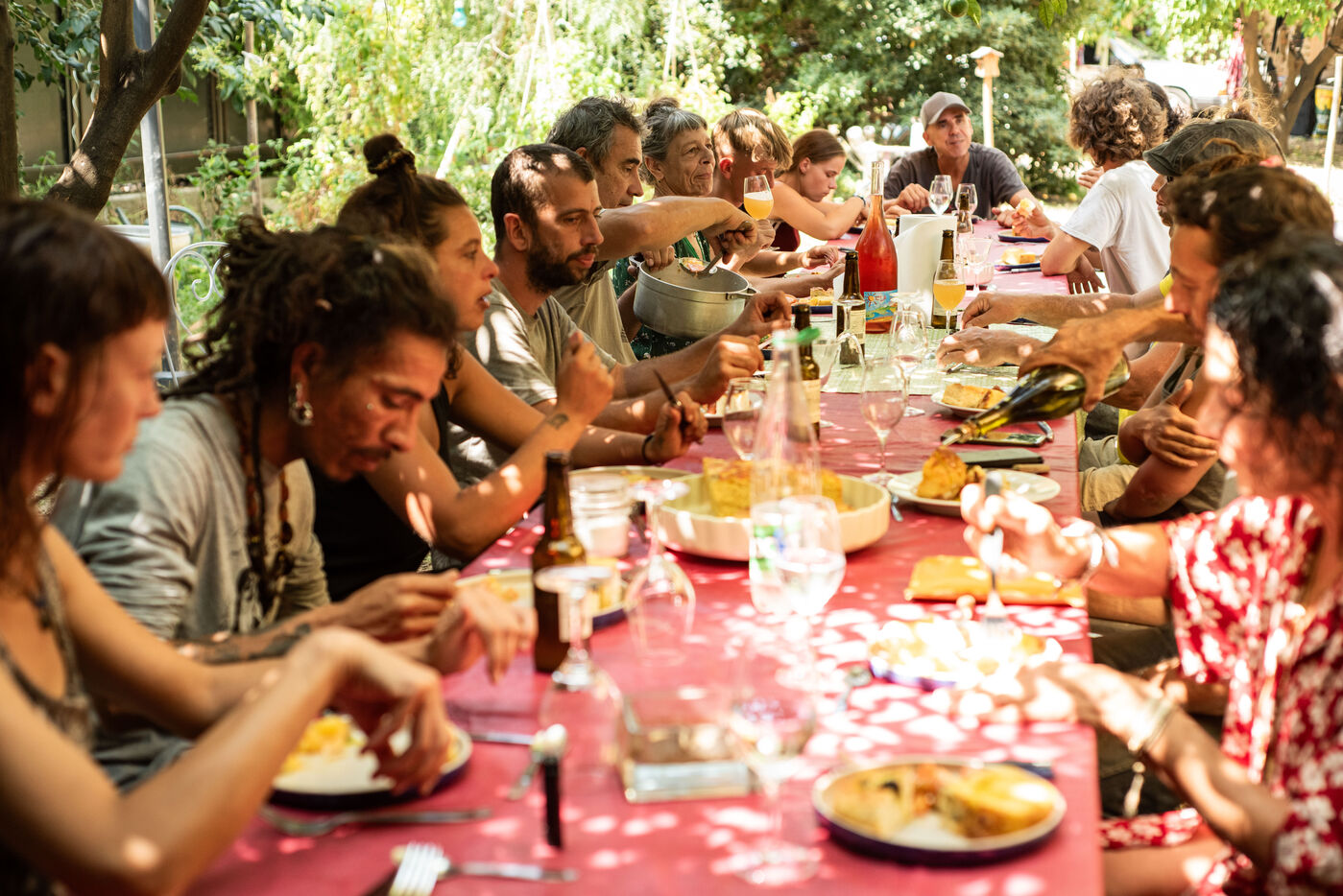 Dans cette région, l’entraide, le faire ensemble, est un élément nécessaire à la production du vin. Être indépendant, hors du circuit des coopératives, amène les vigneron·nes à « faire avec ». Une vigne n’existe pas seule, il faut une tribu pour faire un vin. Faire du vin nature, sans l’utilisation de produits chimiques et de sur-mécanisation, nécessite plus que jamais les mains des hommes et des femmes.