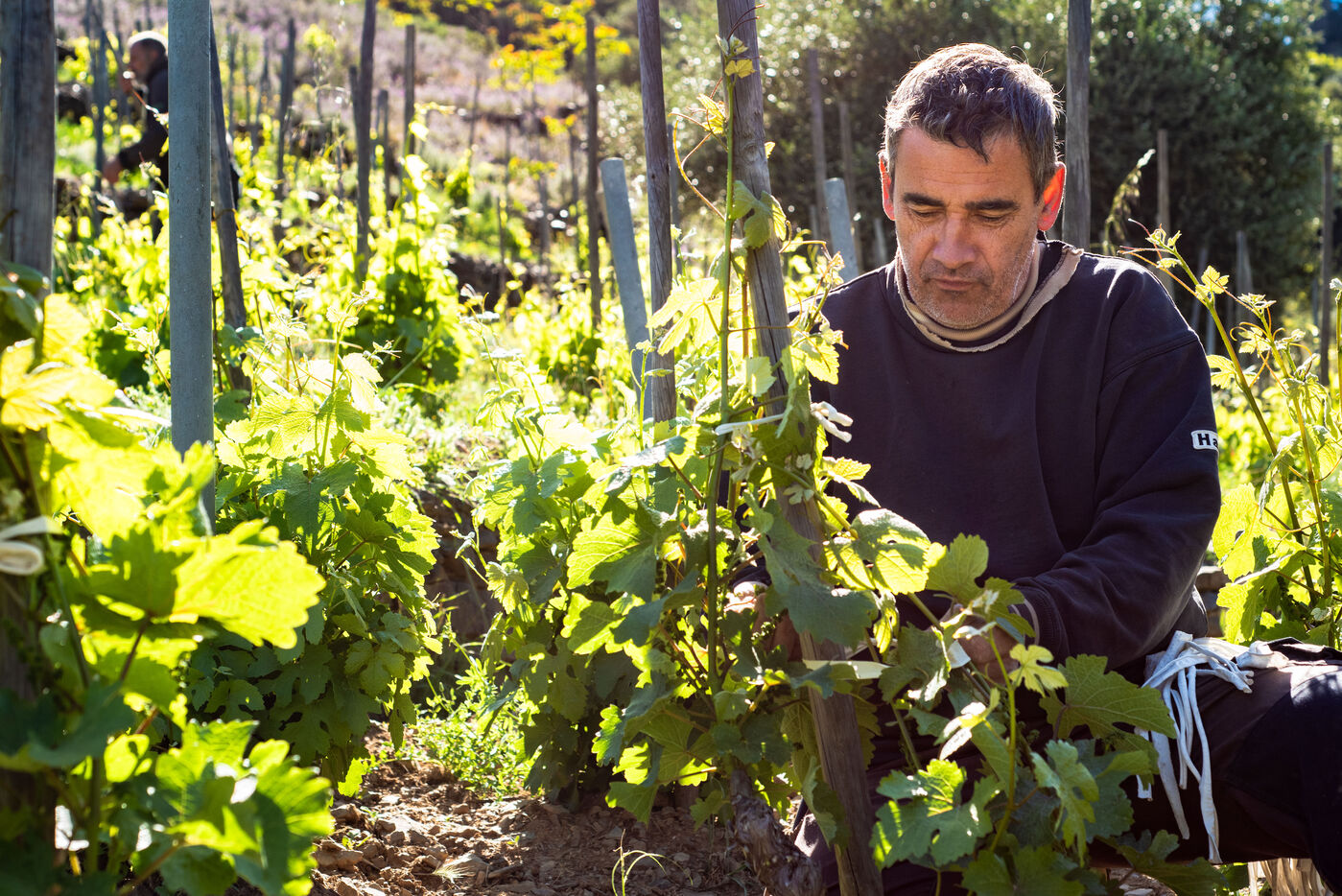 Bruno Duchêne is a passionate, independent winegrower who bought some vineyard land in 2002 from Mr Castex, an old hand in the region from whom he learned a lot by doing and listening. His vineyards are in Banyuls-sur-Mer. Bruno cultivates his vines on terraces, ploughing by hand and using a caterpillar. He leaves some of his vineyards grassed over, and sometimes cuts back the undergrowth depending on the soil's need for water. He produces natural wines and uses only 3 or 4 organic treatments a year. He is developing an economic model that involves growing his 4 hectares of vines and buying grapes from other winegrowers, which he then vinifies himself. Bruno says that you have to observe, try and adapt to the vine. He seems to be nothing more than an alchemist in the middle of his vines, dependent on the goodwill of nature.