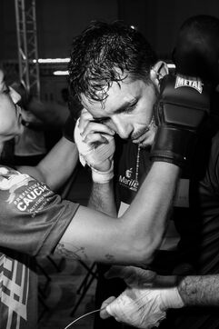 This project is envisioned by the meeting of comabatants and the microcosm around them. The project will be a mix of photographs of materials, bodies and close-ups during training and combat. Associated with these times will be documentary photographs of the fighters/trainers in their daily lives, with their families, at work. Recordings will be made of intimate moments.
