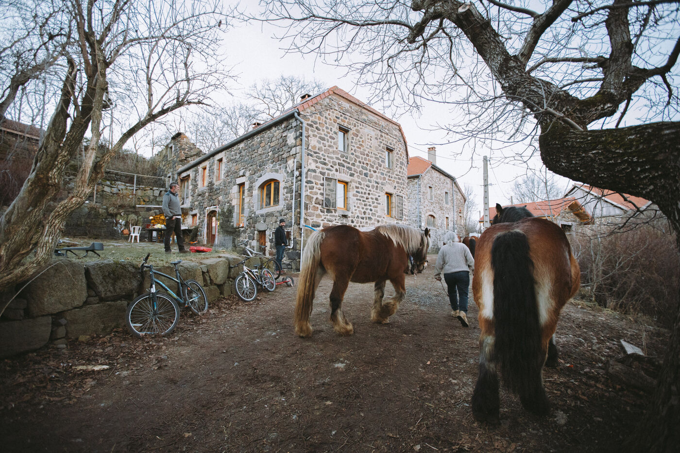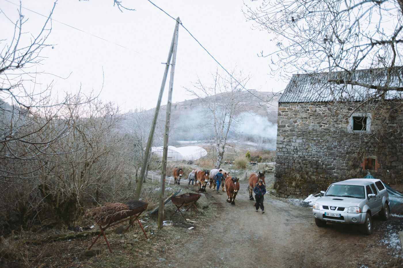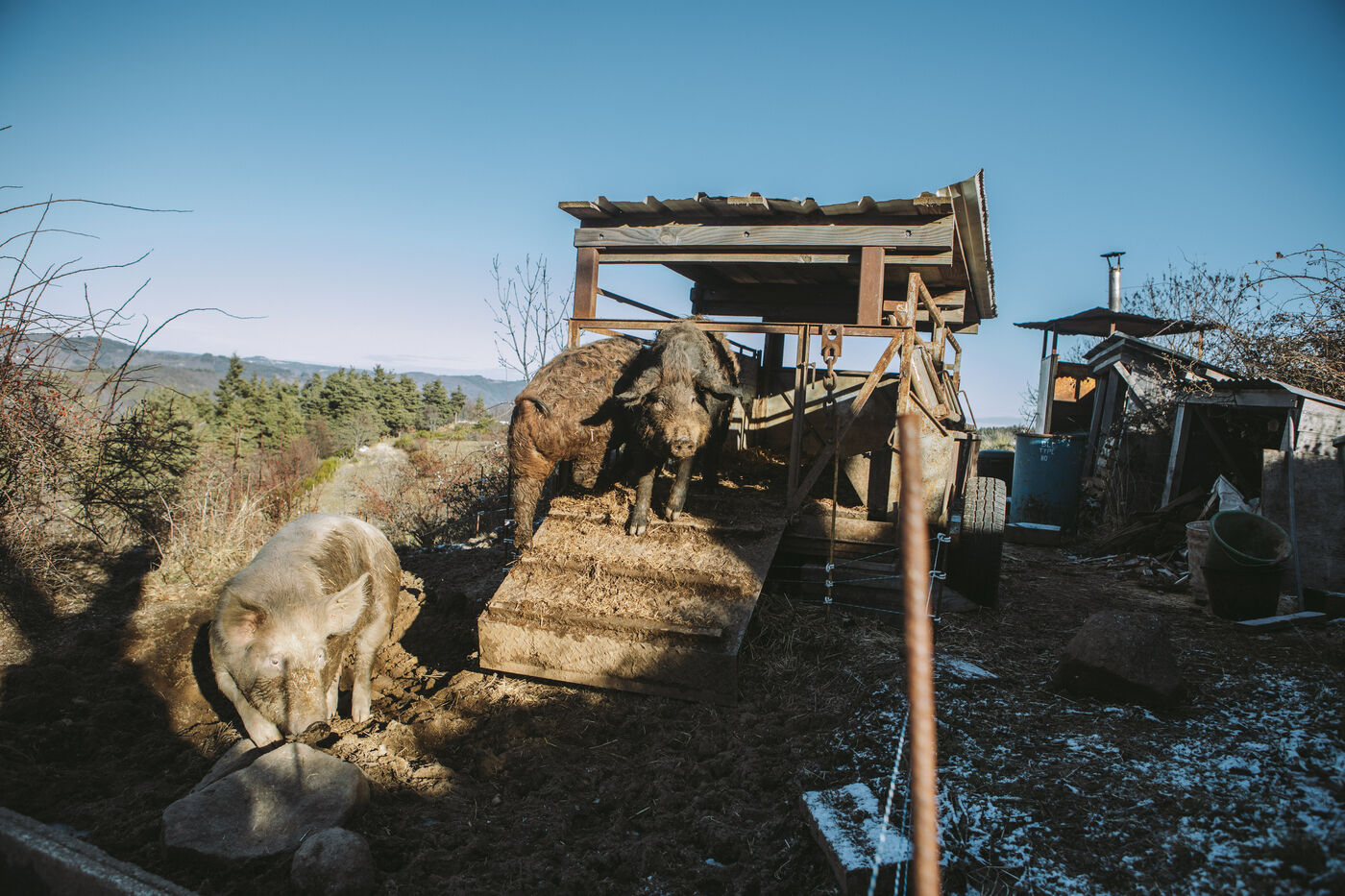 France - Treynas, 21 janvier 2024, sur la commune de Chaneac en Ardèche, la communauté agricole auto-gérée Longo Maï s'explique après avoir abattu sept chiens appartenant à des chasseurs, le samedi 16 décembre 2023. Selon ses membres, une meute d'une dizaine de chiens a attaqué leurs animaux. Retour sur les circonstances et l'histoire de cette communauté ardéchoise vivant principalement de l'exploitation forestière et de l'agriculture raisonnées. Photographies de Marie Julliard / Hans Lucas.