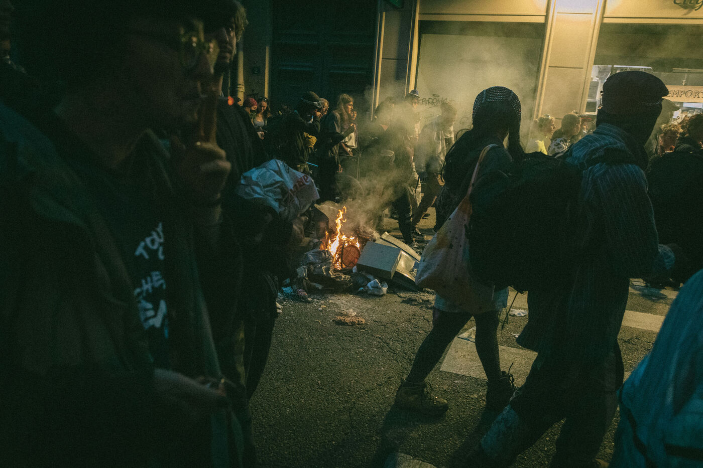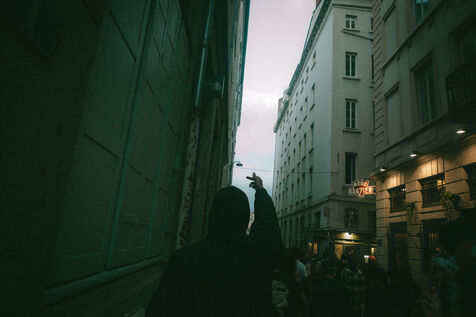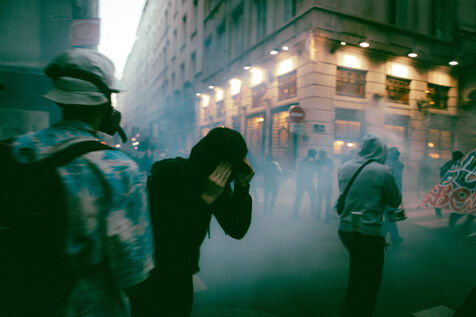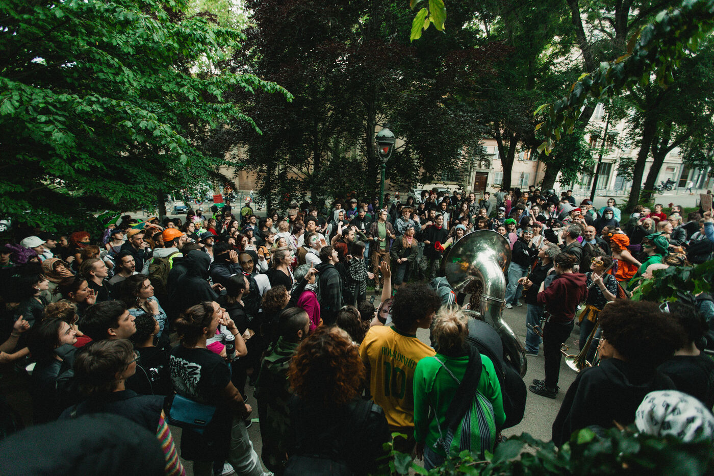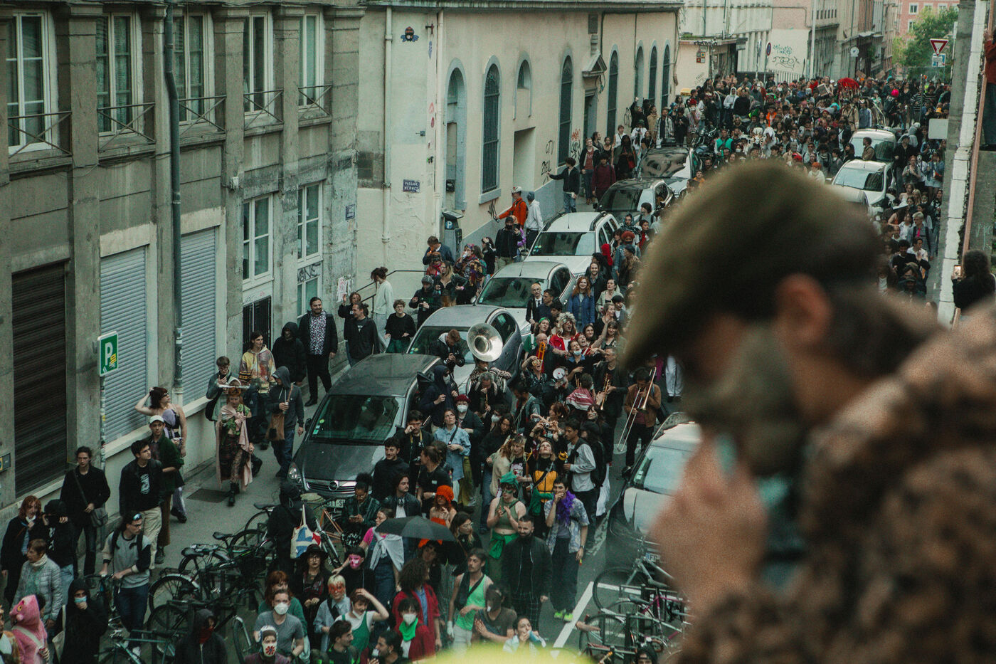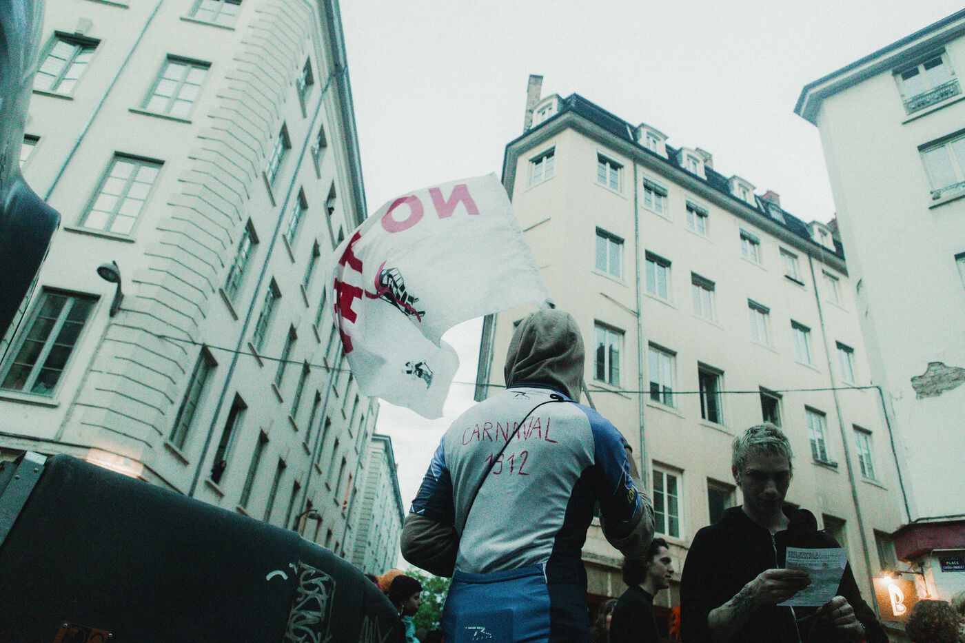 FRANCE - Lyon, vendredi 24 mai 2024, une quarantaine d'organisations (Lyon insurrection, Action justice climat Lyon, les Soulèvements de la terre Lyon, l'assemblée des Gilets jaunes Lyon et environs...) ont appelé à la mobilisation à Lyon ce vendredi 24 mai, à l'occasion de la seconde édition du « carnaval des Pentes », « festif et revendicatif » pour protester contre « les Jeux Olympiques, la guerre en Palestine et les réformes de Macron ». Malgré l'interdiction de l'événement par la préfecture, les manifestants se sont rassemblés place de la Croix-Rousse. Photographie de Marie Julliard / Hans Lucas.