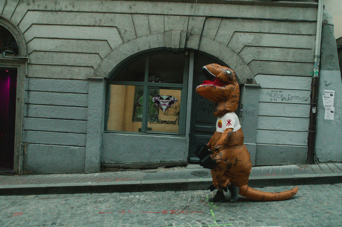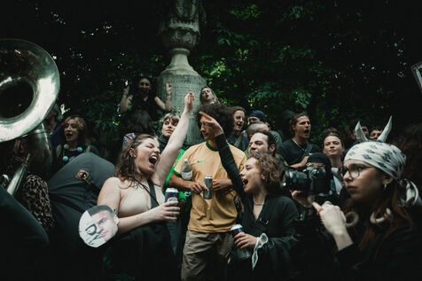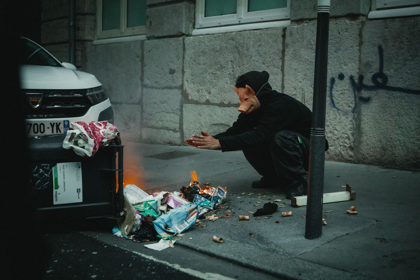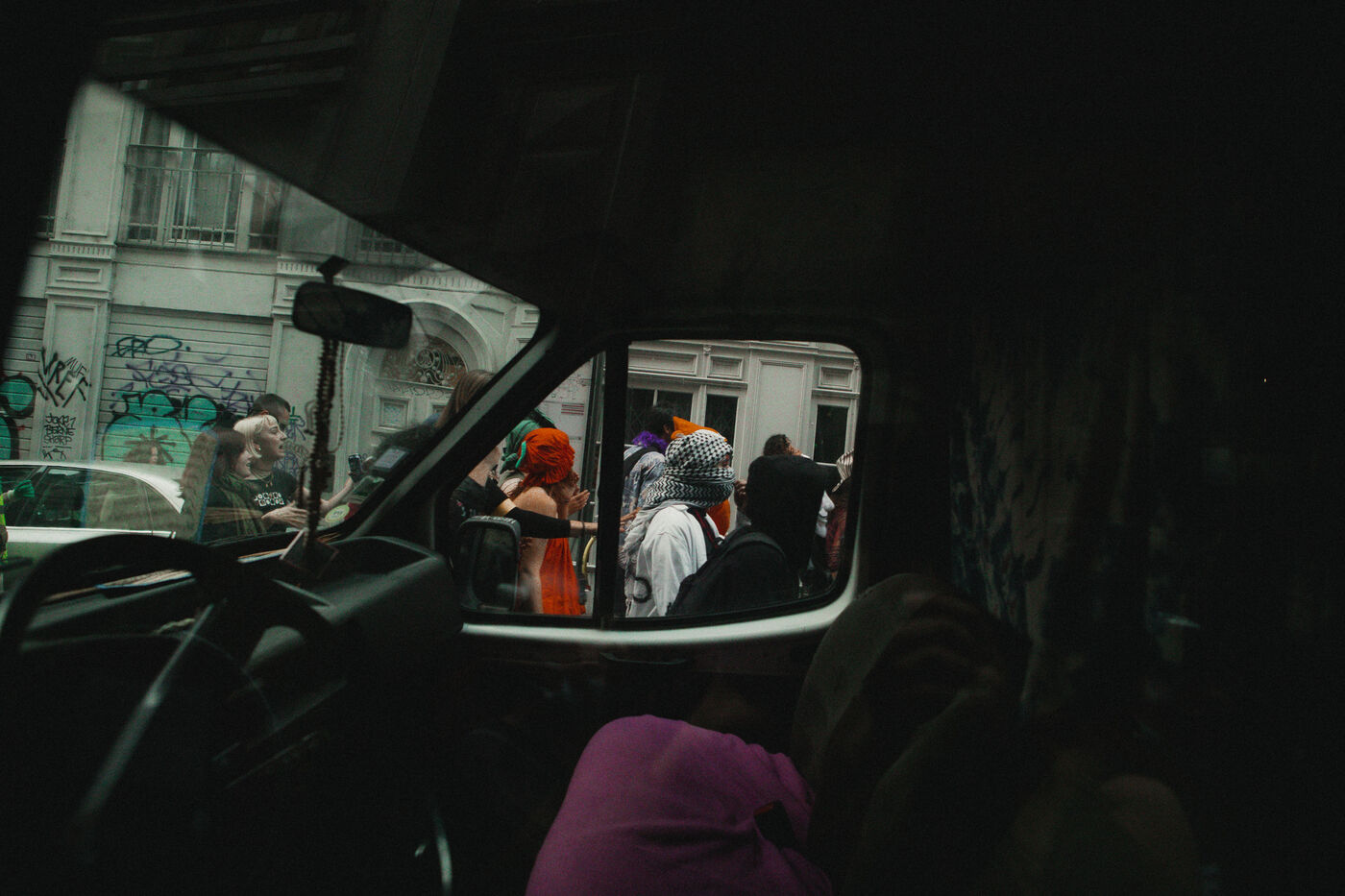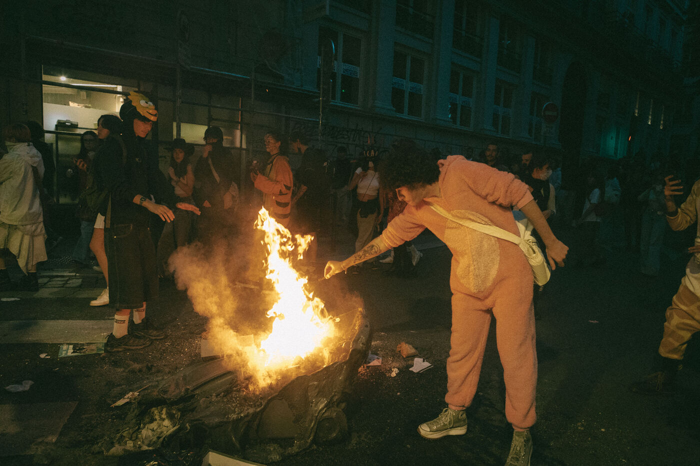 FRANCE - Lyon, vendredi 24 mai 2024, une quarantaine d'organisations (Lyon insurrection, Action justice climat Lyon, les Soulèvements de la terre Lyon, l'assemblée des Gilets jaunes Lyon et environs...) ont appelé à la mobilisation à Lyon ce vendredi 24 mai, à l'occasion de la seconde édition du « carnaval des Pentes », « festif et revendicatif » pour protester contre « les Jeux Olympiques, la guerre en Palestine et les réformes de Macron ». Malgré l'interdiction de l'événement par la préfecture, les manifestants se sont rassemblés place de la Croix-Rousse. Photographie de Marie Julliard / Hans Lucas.