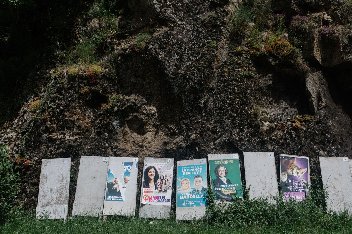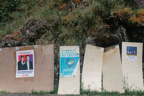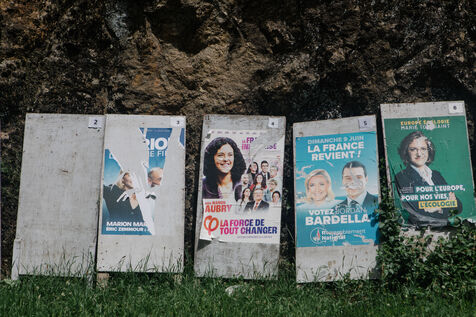 ILLUSTRATION - posters of French candidates for the European elections on June 9, 2024 on electoral billboards. Photography by Marie Julliard / Hans Lucas.
