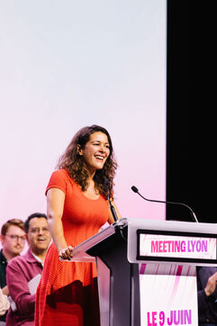 FRANCE - Lyon, jeudi 6 juin 2024, dernier grand meeting de la campagne de l Union Populaire des elections europeennes a la Sucriere à Lyon, avec Jean-Luc Melenchon et la candidate Manon Aubry pour la liste LFI, la France Insoumise. En presence de la juriste franco-palestiniennne Rima Hassan, et des deputes Gabriel Amard et Idir Boumertit. Slogan : La force de tout changer. Photographie de Marie Julliard / Hans Lucas.