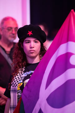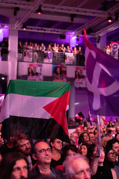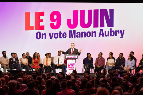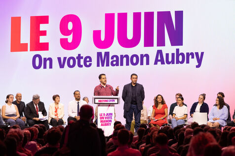 FRANCE - Lyon, Thursday, June 6, 2024, last major meeting of the Union Populaire campaign for the European elections at La Sucriere in Lyon, with Jean-Luc Melenchon and Manon Aubry for the LFI list, France Insoumise. In the presence of French-Palestinian jurist Rima Hassan, and MPs Gabriel Amard and Idir Boumertit. Slogan: The strength to change everything. Photography by Marie Julliard / Hans Lucas.