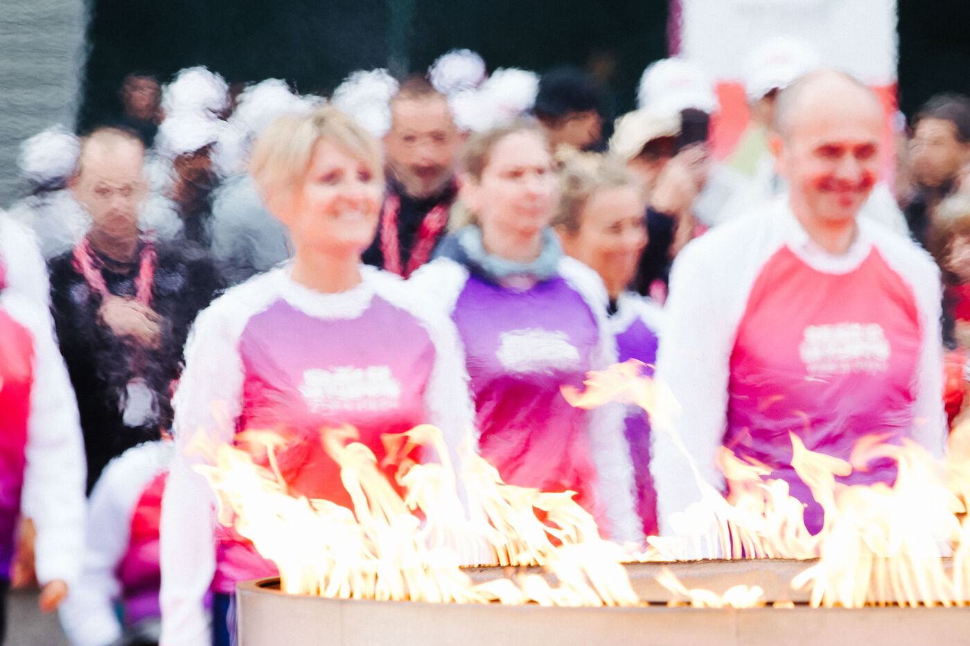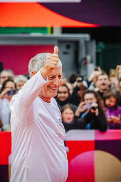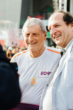 Relais de la Flamme Olympique et allumage du chaudron par Jean-Michel Larqué à Saint-Etienne
