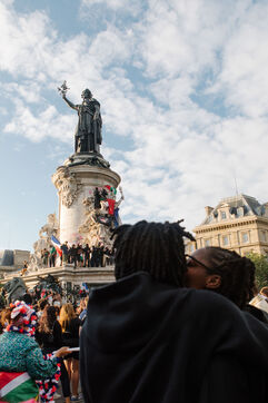 FRANCE - Paris, dimanche 7 juillet 2024, manifestation place de la République suite au résultat de l'élection législative constituant une nouvelle assemblée. Photographie de Marie Julliard / Hans Lucas.