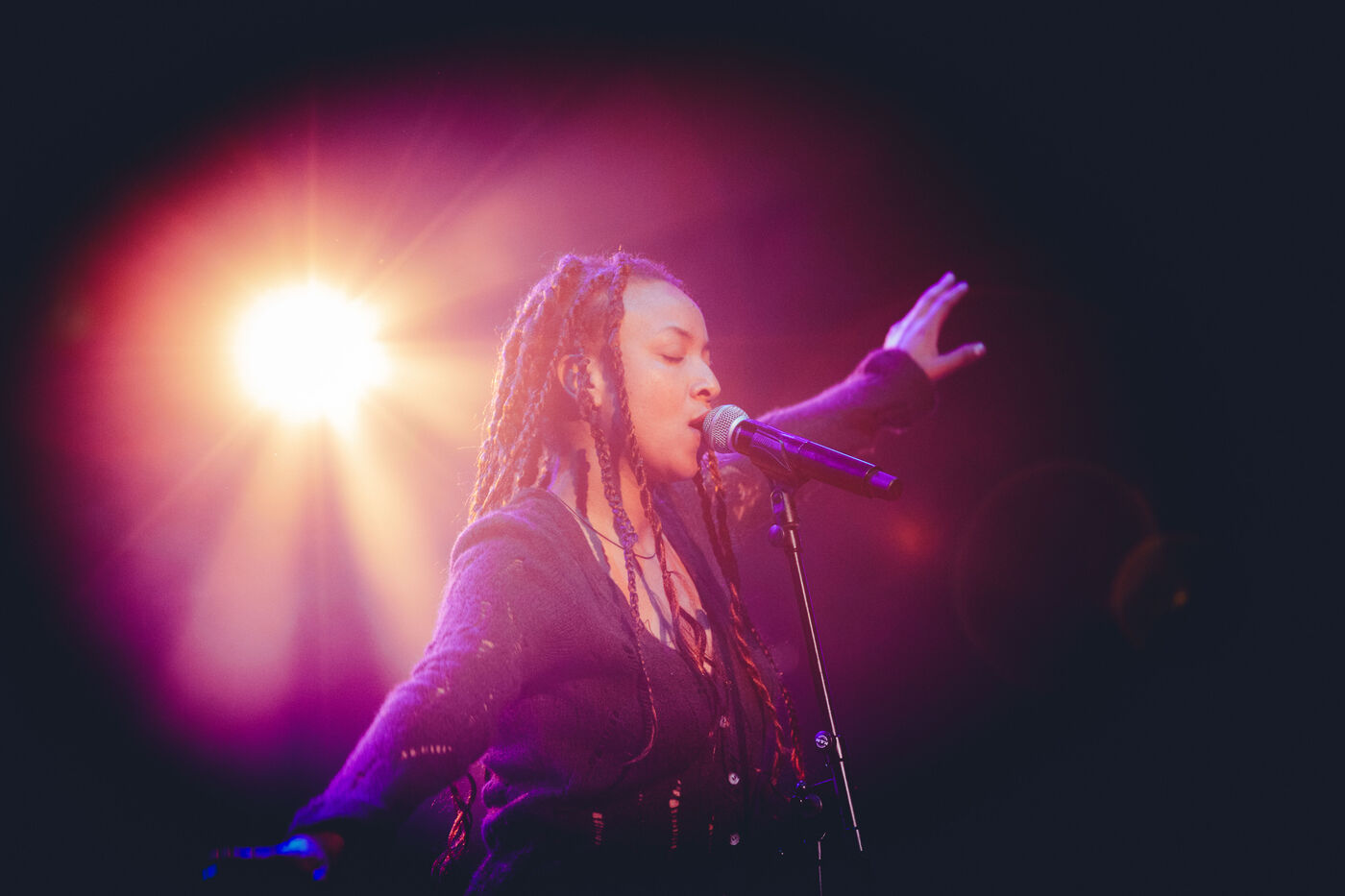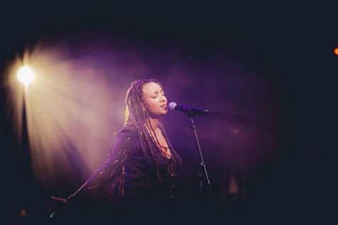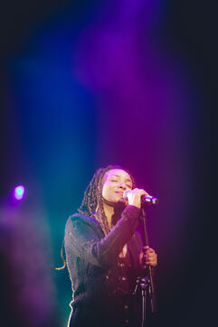 FRANCE - Vienne, vendredi 12 juillet 2024, concert de e, groupe de Kutu, electro jazz ethiopien au Théâtre Antique de Vienne dans le cadre de la All Night pour la 43ème édition du festival de Jazz à Vienne, avec Hewan Gebrewold, Théo Ceccaldi, Akemi Fujimori-Poivre, Valentin Ceccaldi, Cyril Atef. Photographie de Marie Julliard / Hans Lucas.