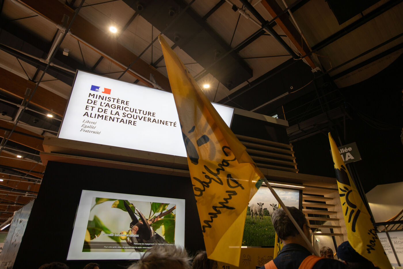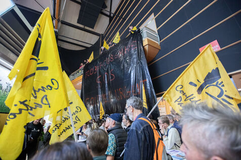 FRANCE - Cournon d’Auvergne, 02 octobre 2024, le Sommet de l’Elevage a ouvert ses portes hier à la Grande Halle d’Auvergne, près de Clermont-Ferrand, l’événement, l’un des plus grands rendez-vous européens dédiés aux professionnels, se tient jusqu’à vendredi. le préfet du Puy-de-Dôme Joël Mathurin a pris la parole lors d’une intervention spontanée de la Confédération Paysanne au sujet des maladies touchant le bétail. Egalement les remises de prix des concours de vache laitière. Photographie de Marie Julliard / Hans Lucas.
