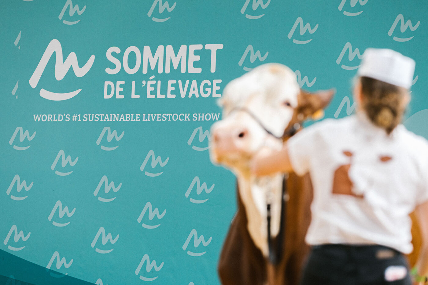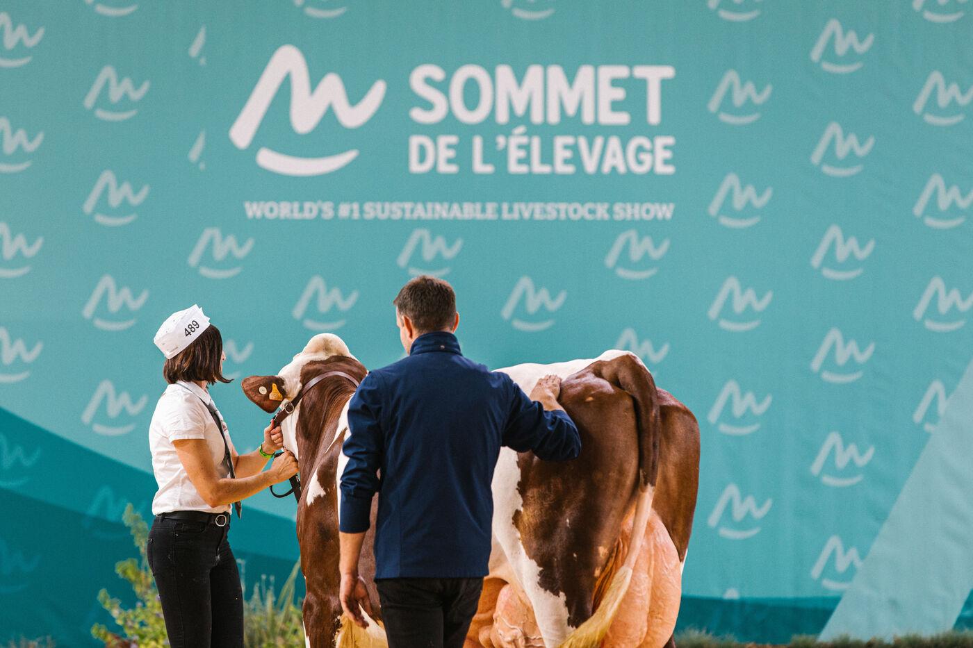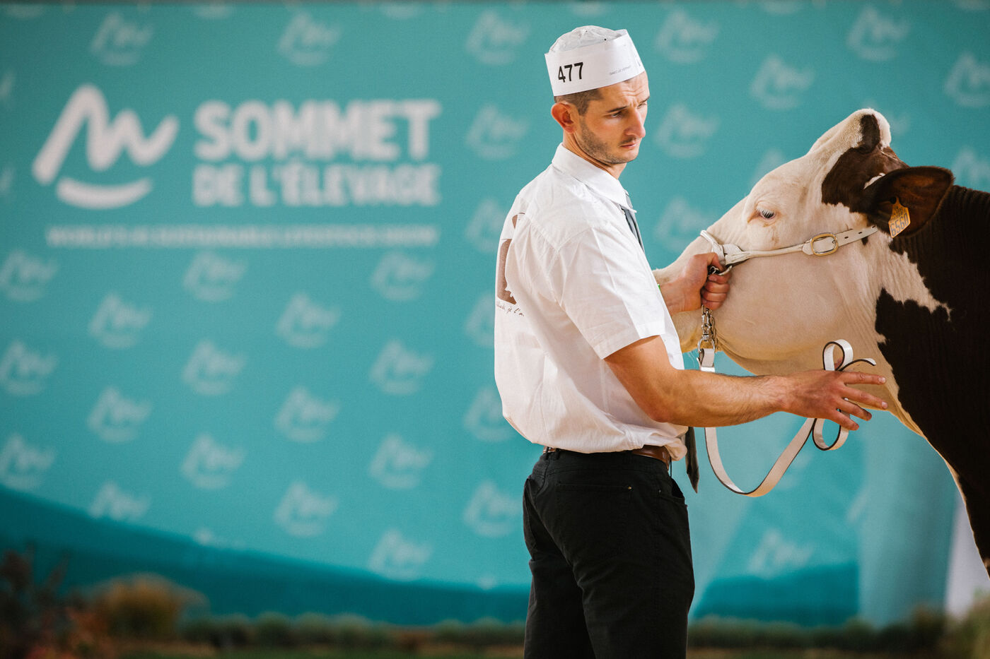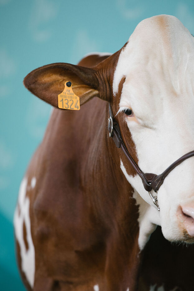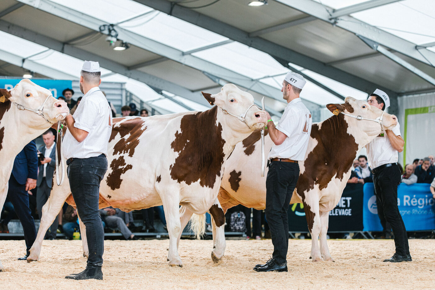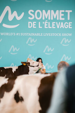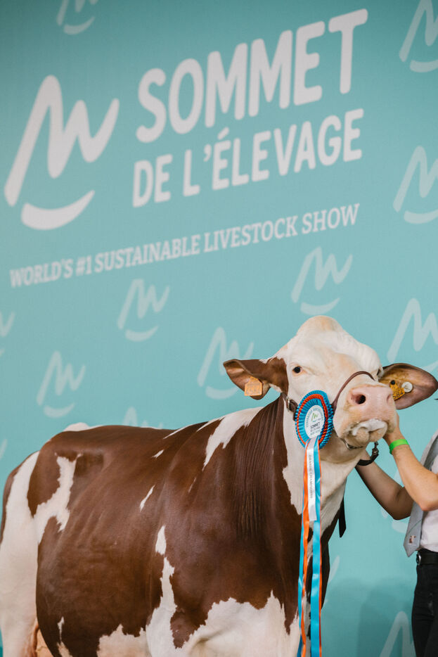 FRANCE - Cournon d’Auvergne, 02 octobre 2024, concours de bovins laitiers de race montbéliarde dans le hall 4 de la Grande Halle, au Sommet de l'élevage. Photographie de Marie Julliard / Hans Lucas.