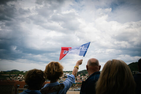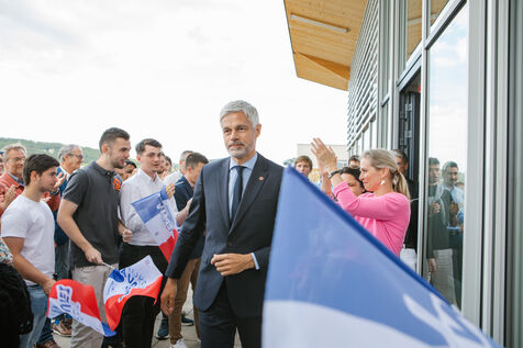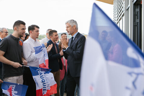 FRANCE - Le Puy-en-Velay, Sunday May 18, 2025, result of the vote for the presidency of the LR Republicans between Laurent Wauquiez, leader in the assembly and Interior Minister Bruno Retailleau in the premises of the Les Républicains Federation in Le Puy-en-Velay. He was greeted with tears and smiles by flag-waving activists in his hometown after his defeat. Photography by Marie Julliard / Hans Lucas.