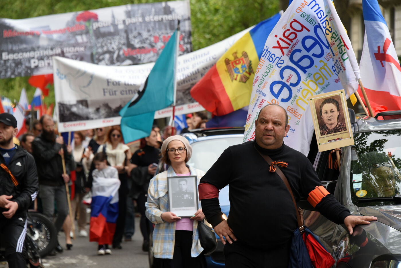 Les gens participent à la manifestation russe Régiment Immortel marquant le 78e anniversaire de la victoire sur l'Allemagne nazie pendant la Seconde Guerre mondiale (Jour de la Victoire en Europe).