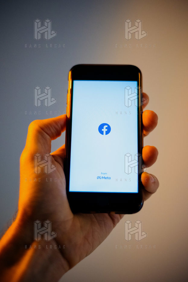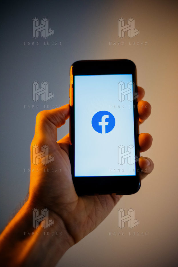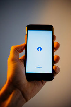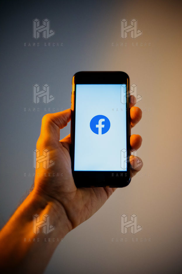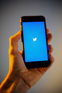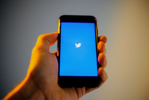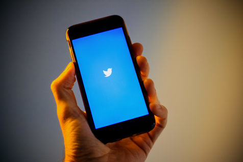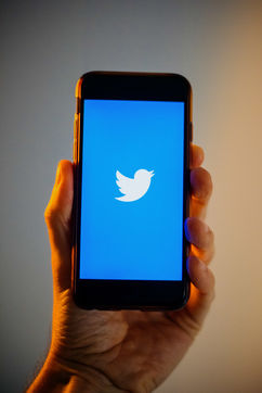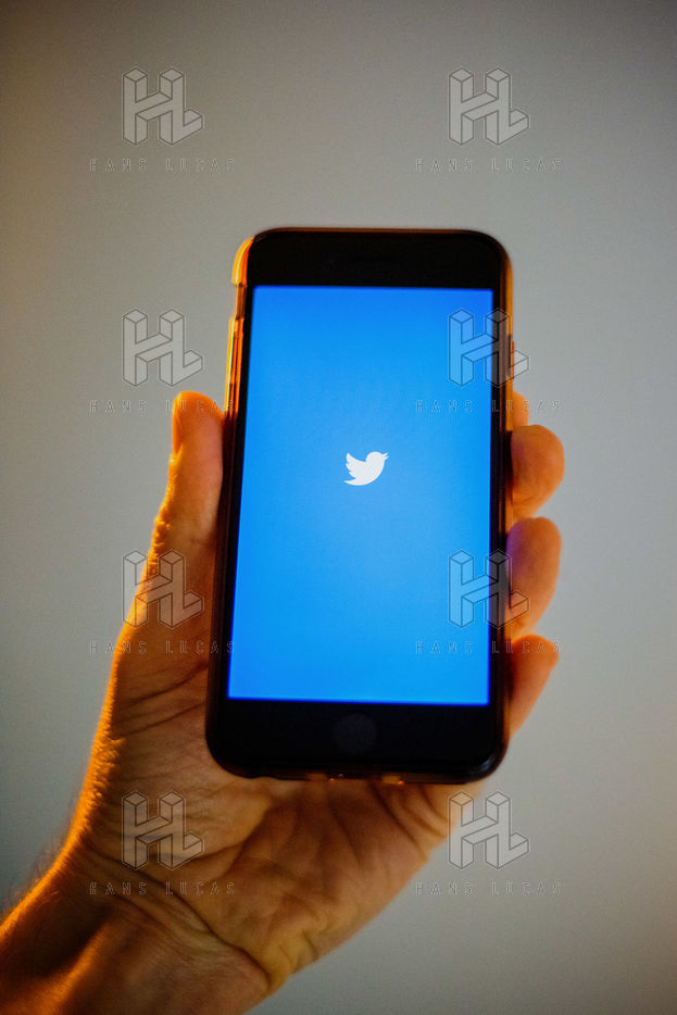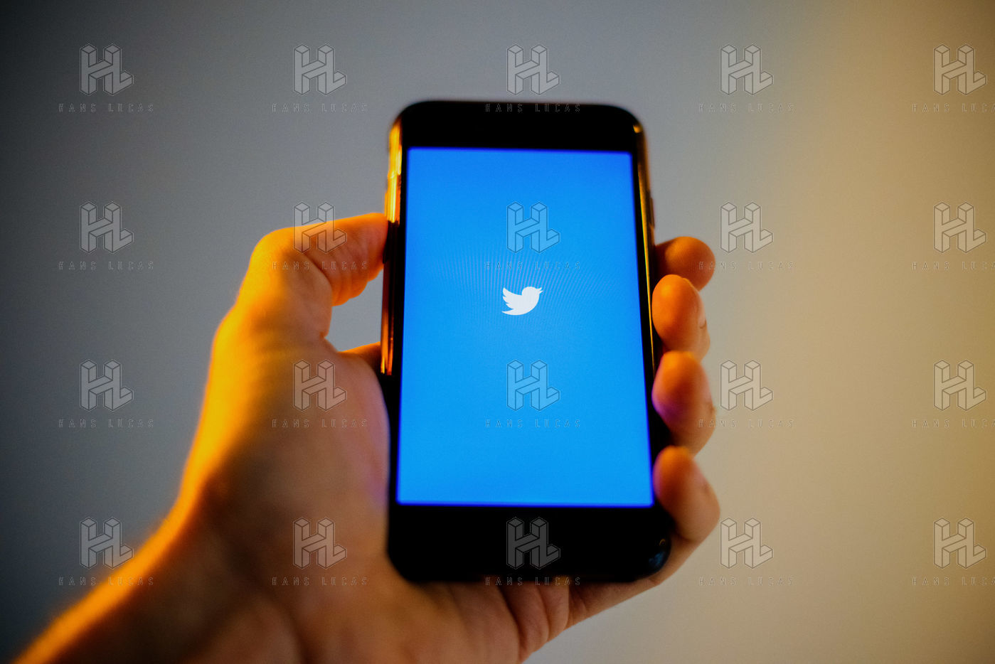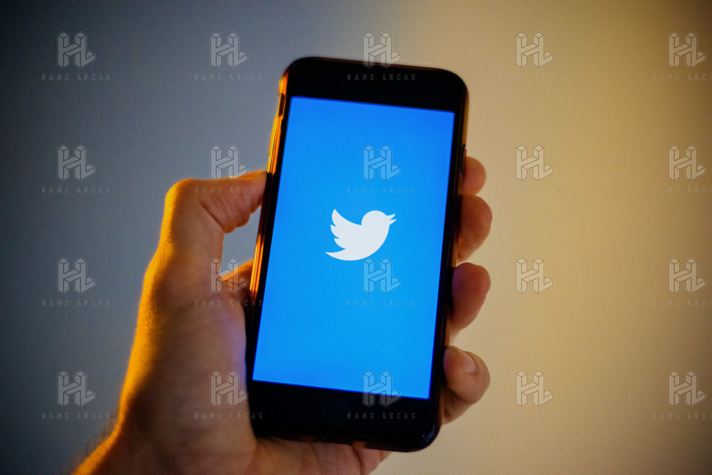 Ecrans de démarrage des applis Twitter et Facebook sur un iPhone tenu par une main et éclairés par une lumière orange