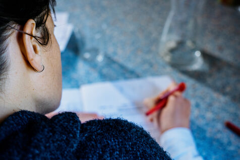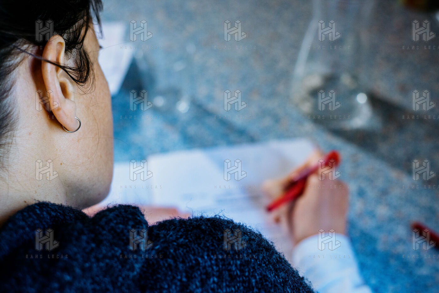 Une professeure d'espagnol corrige ses copies dans la cuisine de son domicile à Toulouse.