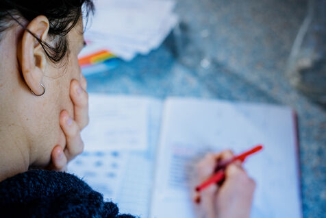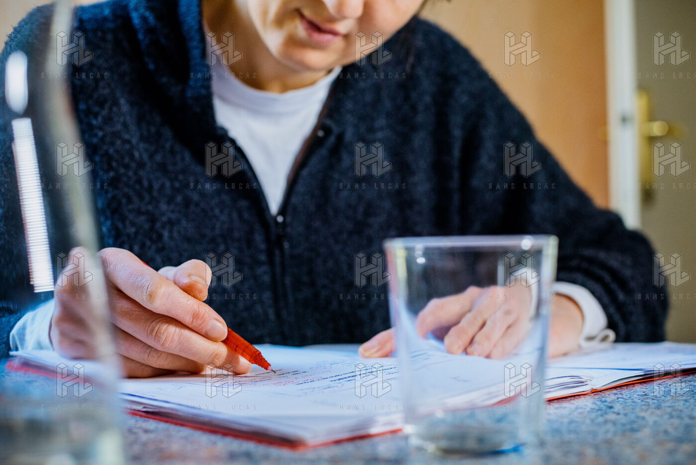 A Spanish teacher corrects her papers in the kitchen of her home in Toulouse.