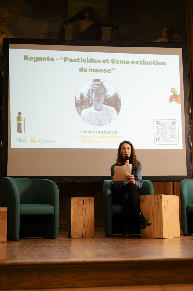 Helene Grosbois, autrice et militante pour le vivant lors du lancement de son livre La disparition du vivant et moi aux éditions Marabout. Passée du monde de la finance à l’agriculture biointensive, elle incarne les changements indispensables à mettre en place pour arrêter l’effondrement du Vivant, recréer de la biodiversité et un monde souhaitable.