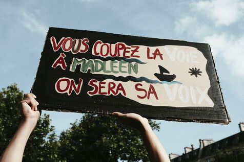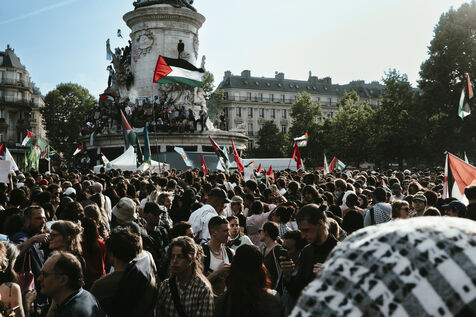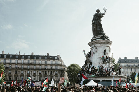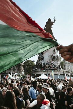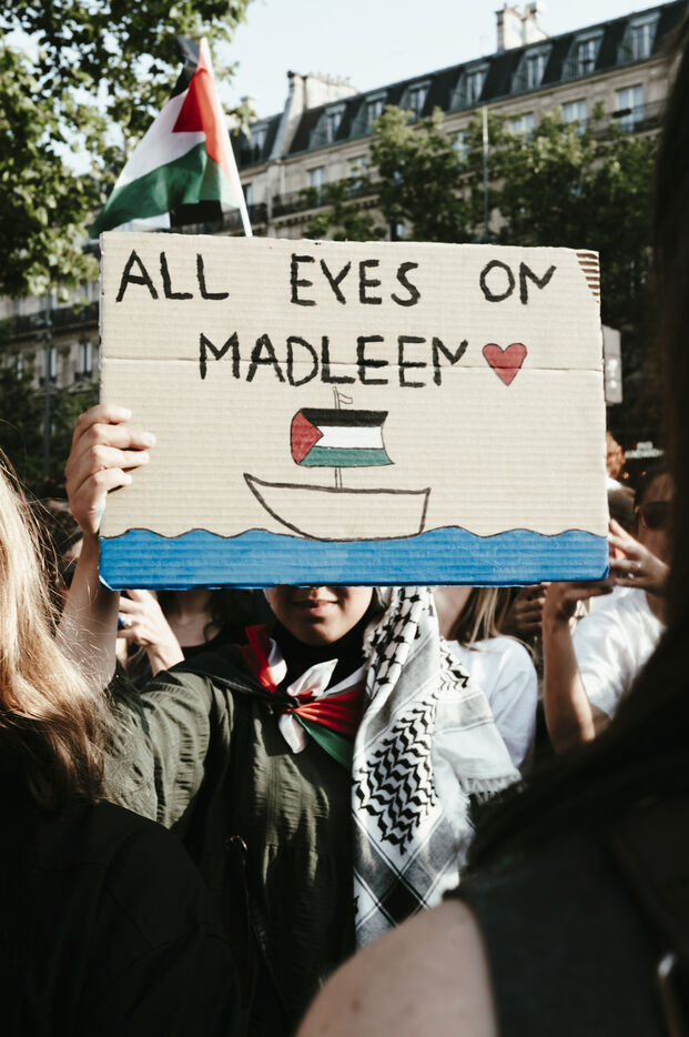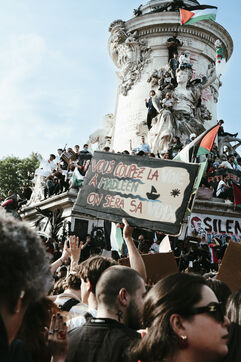 Rassemblement suite à l'arrestation des militants et journalistes et de arraisonnement de la flottille de la liberté Madleen, et en soutien au peuple de Gaza, contre le genocide en cours et pour une cessez le feu immédiat, place de la République.