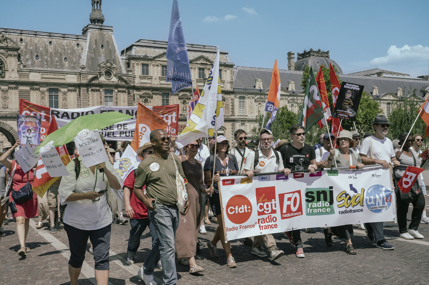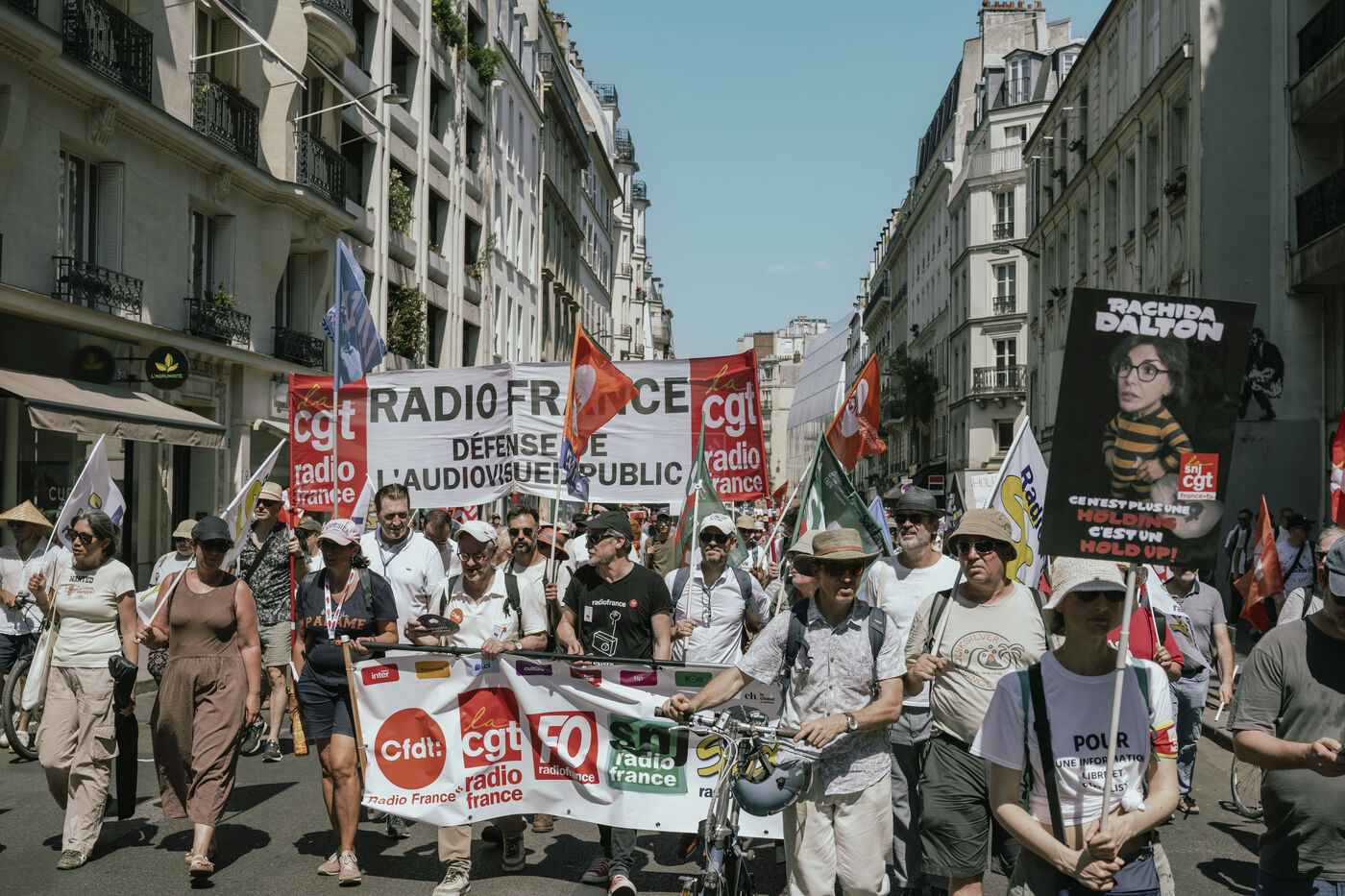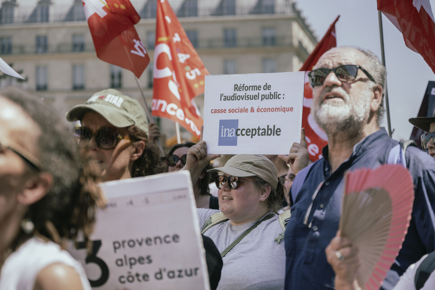 Manifestation contre la holding de l’audiovisuel public porté par la ministre de la Culture Rachida Dati. Une mobilisation qui fait suite à plusieurs jours de grève au sein de Radio France, de France Télévisions et de l’INA.