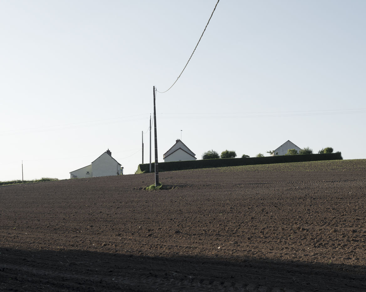 Habitué des marges, Marc Loyon photographie l'architecture des entre-deux et le paysage des transitions : zones périphériques, artisanales, pavillonnaires, zones agricoles et paysages plus sauvages constituent la matière première de ses recherches, menées ici en immersion dans les paysages du Bocage Mayennais. En résidence depuis janvier 2020, l'artiste a effectué un patient travail de repérage et de rencontres. L'exposition présentée au centre d'art de Pontmain témoigne de cette approche exigeante : dans chacune de ses photographies, l'artiste suggère plutôt qu'il ne démontre, et prend de la distance tout en préservant un regard de proximité, qui pointe délicatement ce que les champs révèlent, ce que les lotissements racontent, lorsque soudain l'incise brutale du goudron écrit de nouvelles lignes sur la terre meuble. Des portraits puissants accompagnent cette traversée du paysage : des habitants qui portent loin leur regard sur le territoire environnant, comme pour mieux inviter le nôtre à y faire sa place.