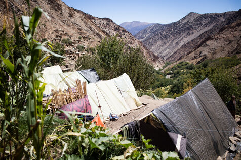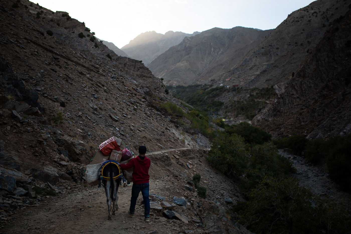 Douar Amndar, close to the epicenter of the earthquake, was very hard hit. The houses are uninhabitable, there have been around twenty deaths and as many injured. Taking refuge in tents on other parts of the mountain, the douar is not accessible by road. To get there, you have to go through steep paths and walk for several hours. The inhabitants use donkeys to help them transport food and equipment to the less damaged areas, but to reach the areas where the victims have taken refuge, they must continue on foot carrying the equipment themselves.