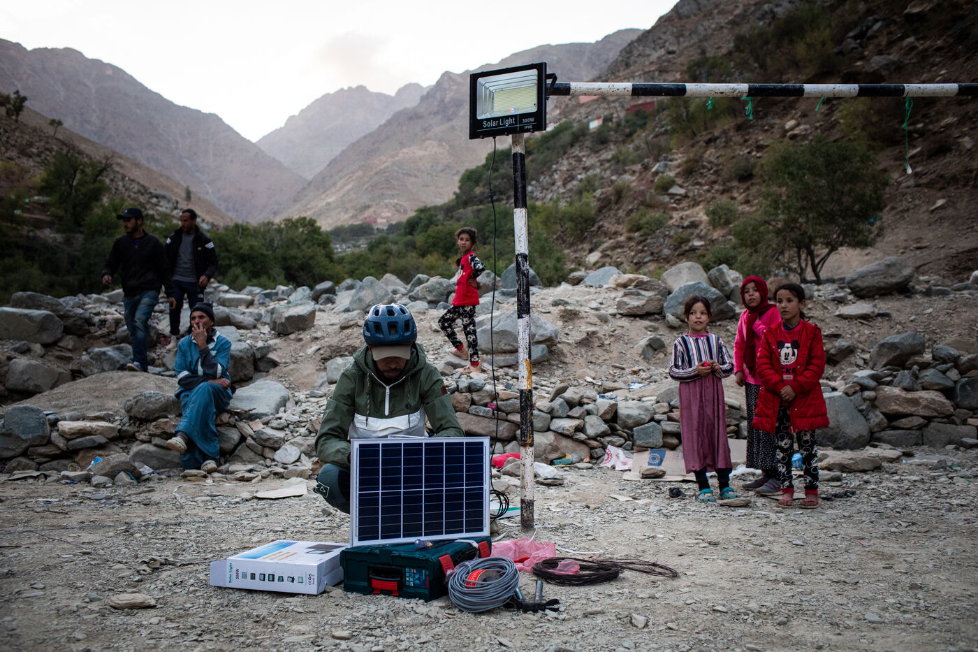Dans la nuit du 8 au 9 septembre 2023, un séisme a secoué le Maroc touchant des zones rurales difficiles d accès. Certains villages n étant accessible qu'à pied ou à dos de mulet, les premiers secours ainsi que les biens de premières nécessités ont mis du temps à arriver. La société marocaine s'est mobilisée en masse pour acheminer jusqu'aux villages les plus enclavés de quoi survivre. À l'image de ce groupe de 4 jeunes hommes qui ont laissé en plan leur travail pour aller apporter de la lumières ainsi que des bâches thermiques à ceux qui sont coupé de tout.