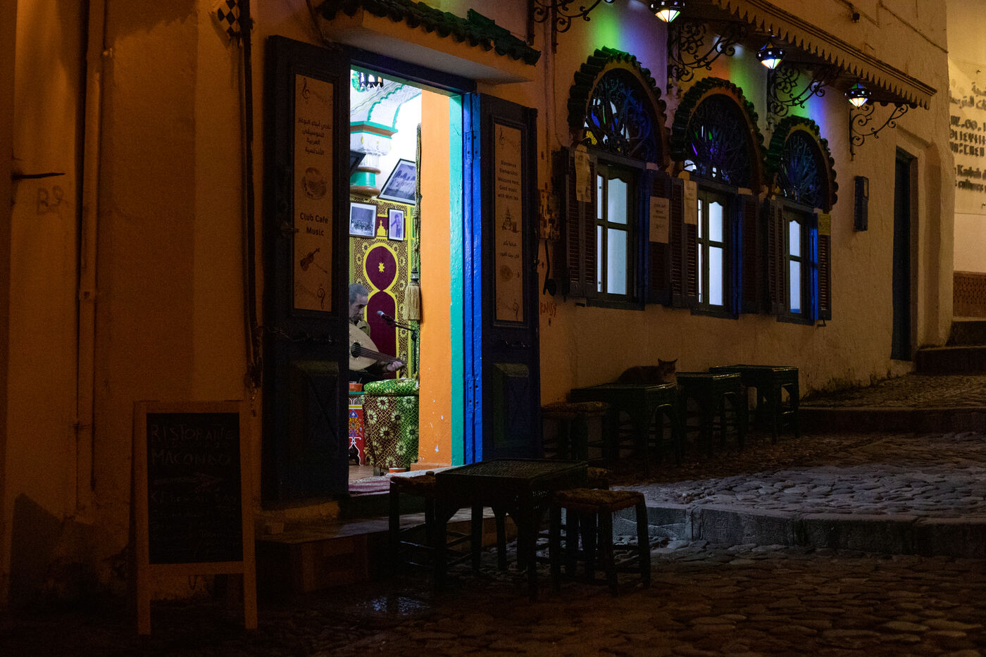 Située sur la place mythique de la Kasbah de Tanger, se situe un lieu hors du temps. C'est dans ce petit espace de 15m², que se rassemble des musiciens arabo-andalous. Ce petit café, est ouvert à tous pour venir prenre un thé à la menthe ou participer à une session en prenant un instrument et en participant. Ces lieux étaient nombreux il y a encore quelques années à Tanger, aujourd'hui ce café fait figure d'exception dans la ville. La musique arabo-andalouse est ancestrale et les musiciens, déjà assez âgés, qui tiennent l'endroit aime à partager avec les visiteurs, musiciens ou non, ces mélodies ancestrales.