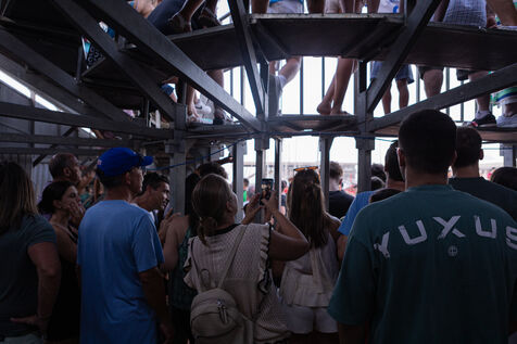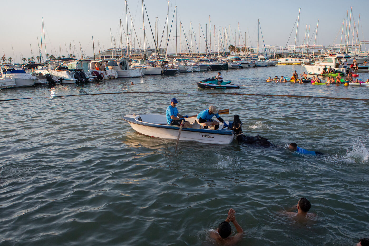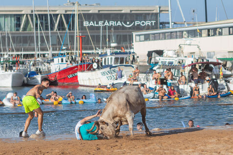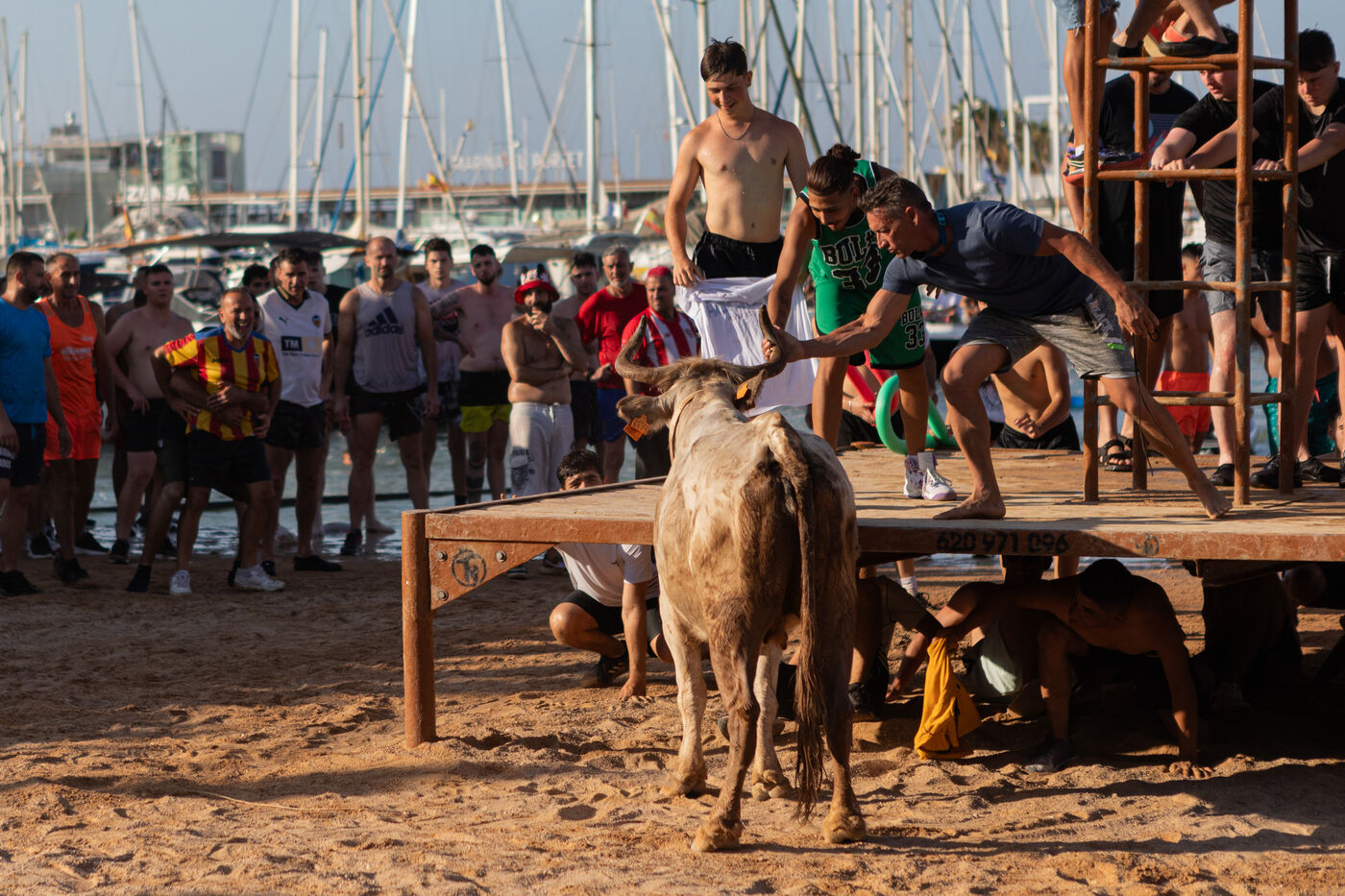 "Bous a la Mar" is a traditional bullfighting event held every summer in Dénia, in the province of Alicante, Spain, as part of the Santíssima Sang patronal festivities. On July 11, 2025, as every year, a temporary arena has been set up by the harbor to host the event. The idea is to run bulls into the arena, where participants attempt to carry them to the sea, sometimes by jumping into the water themselves. Many spectators watch from the stands or from boats moored nearby. Although the event has strong local roots and is recognized as a National Tourist Event, it also sparks debate about animal welfare.