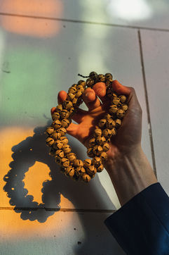 Illustrations of musical instruments, between struck and rubbed stringed instruments, wind instruments and percussive instruments.