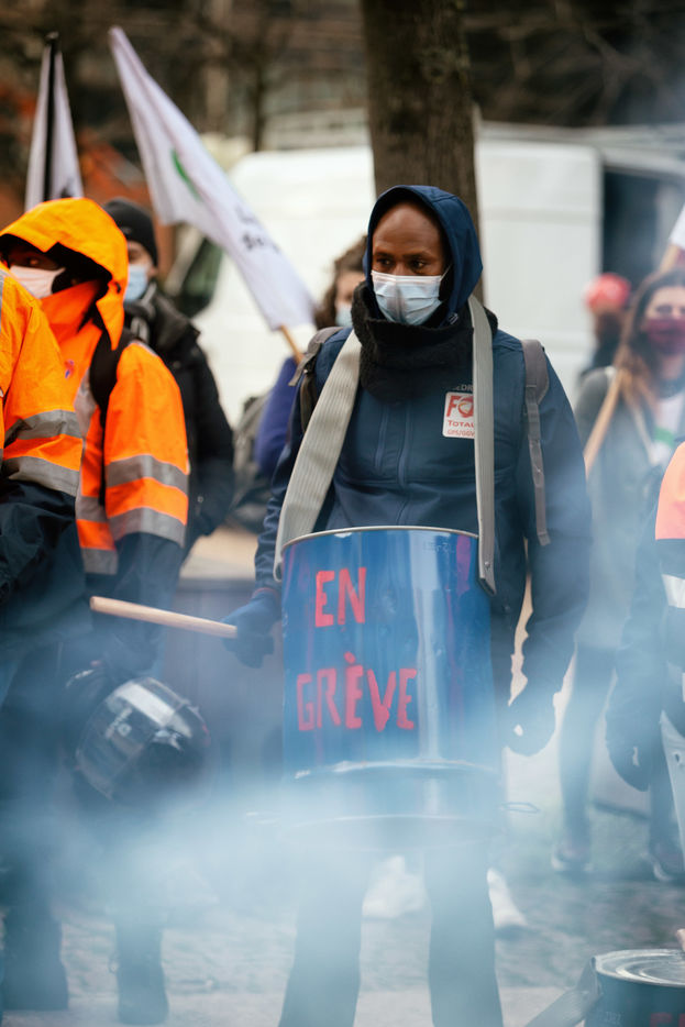Rally of workers at the Grandpuits refinery on strike in front of Total's headquarters in La Défense.