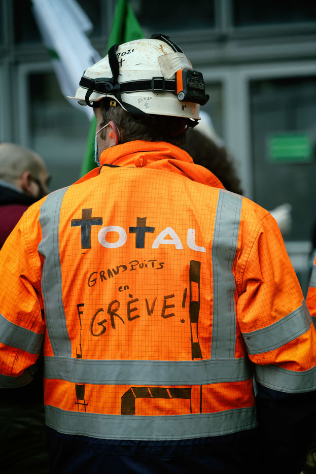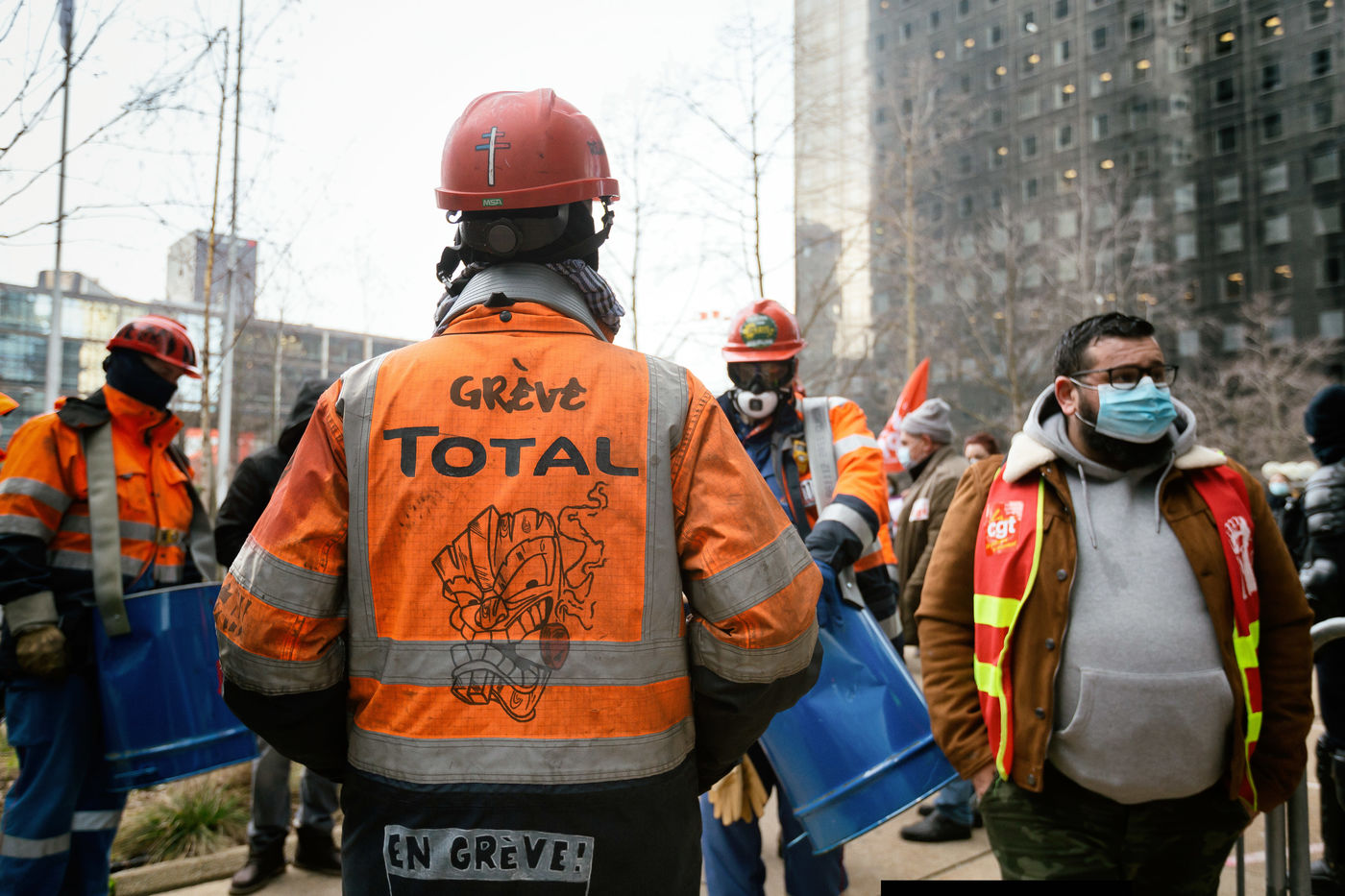Rassemblement des travailleurs de la raffinerie de Grandpuits en grève devant le siège de Total à La Défense.