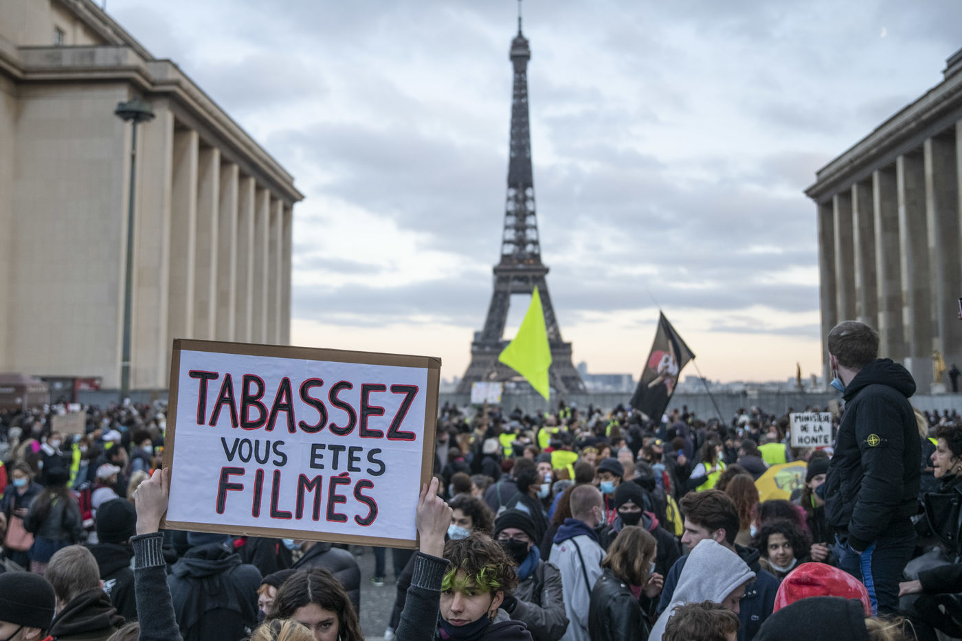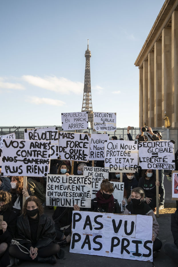 Le 21 novembre 2020, au moins 10 000 personnes se sont rassemblées place du Trocadéro à Paris, afin de dénoncer la proposition de loi sécurité globale, en cours de discussion à l?Assemblée, et l?adoption de l?article 24 la veille. Cet article très controversé prévoit de punir « d?un an d?emprisonnement et de 45 000 euros d?amende » le fait de diffuser des images non floutées d?un policier ou d?un militaire « dans le but manifeste qu?il soit porté atteinte à son intégrité physique ou psychique ».