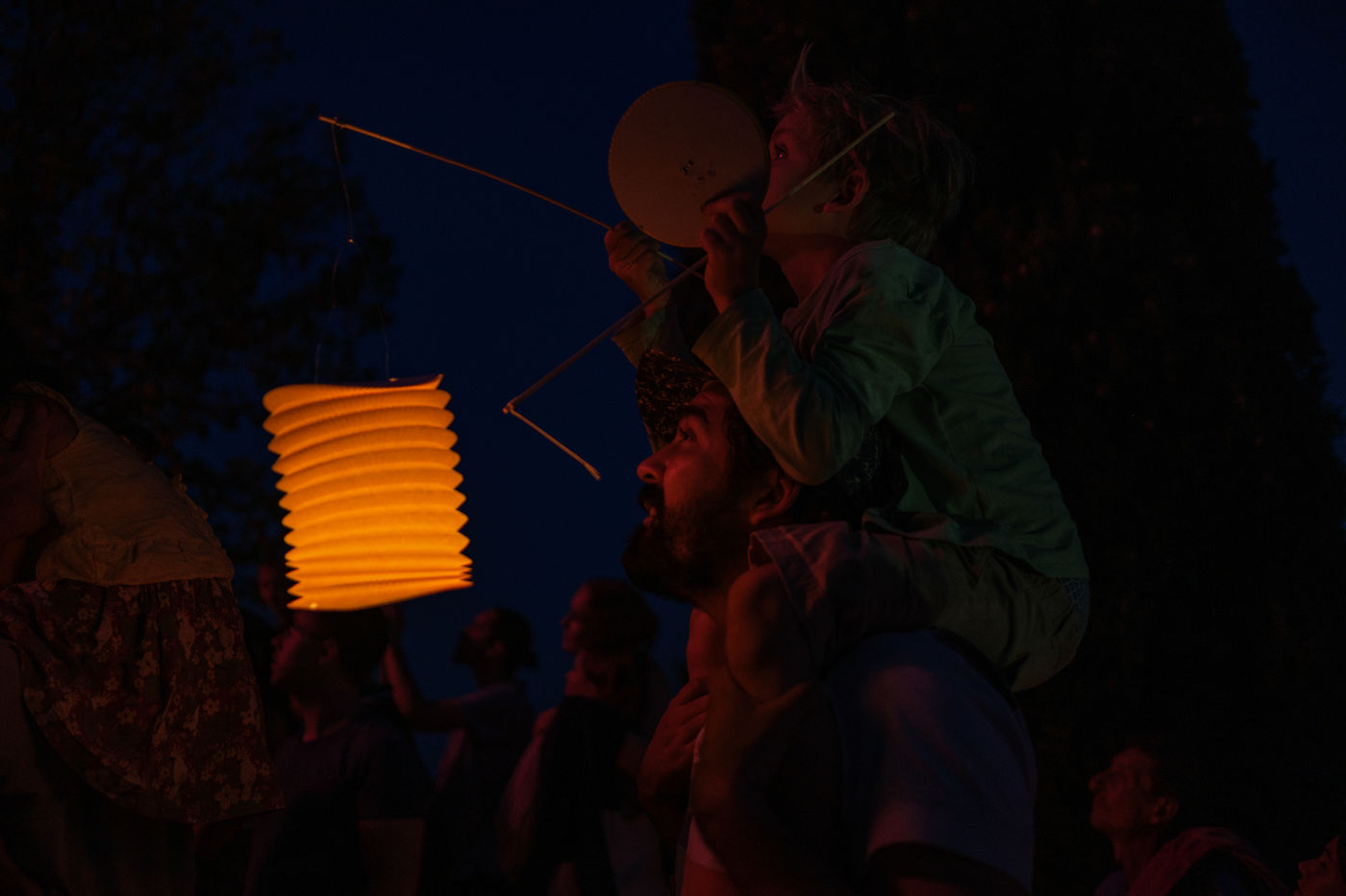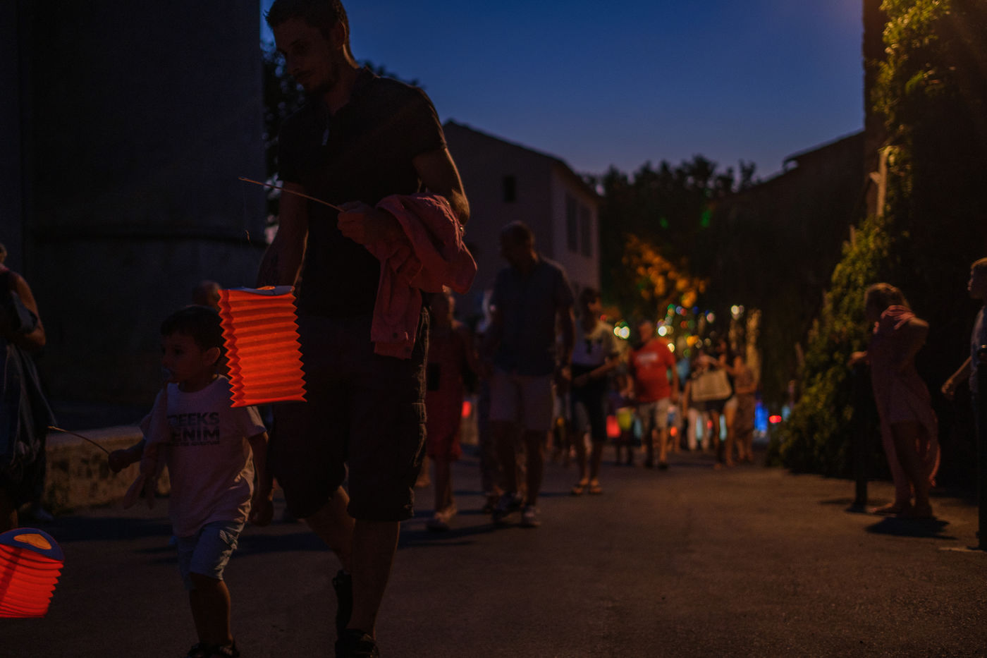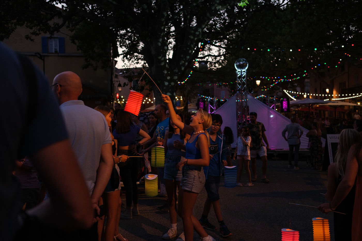 Ball and fireworks on the eve of 2022 Bastille Day in Tourtour, a touristic village in the Var nicknamed the village in the sky of Provence. The children carried lanterns to the church of Saint-Denis above which the fireworks were launched. The ball continued a few meters further down, place des Ormeaux.