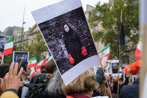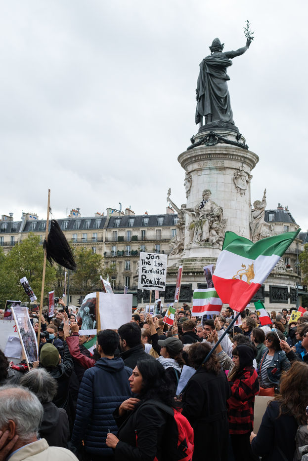 Marche en soutien aux femmes et à la liberté en Iran, à l'appel de plusieurs collectifs et associations, à Paris le 2 octobre 2022. Suite à la mort le 16 septembre de Mahsa Amini, arrêtée et battue par la police des moeurs à Téhéran, chargée de faire respecter le port du voile obligatoire pour les femmes, un mouvement massif de contestation est né en Iran et est soutenu dans les démocraties du monde entier.