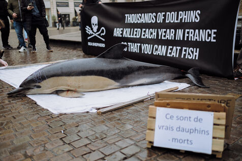 Activists from Sea Shepherd France display the bodies of two dolphins found the day before at sea, victims of captures by 10 and 12m long gillnetters off the coast of Sables d'Olonne. Caroline Roose, Member of the European Parliament, was on board with the Sea Shepherd crew during the recovery of the dolphins' bodies, and is present at the awareness-raising operation.