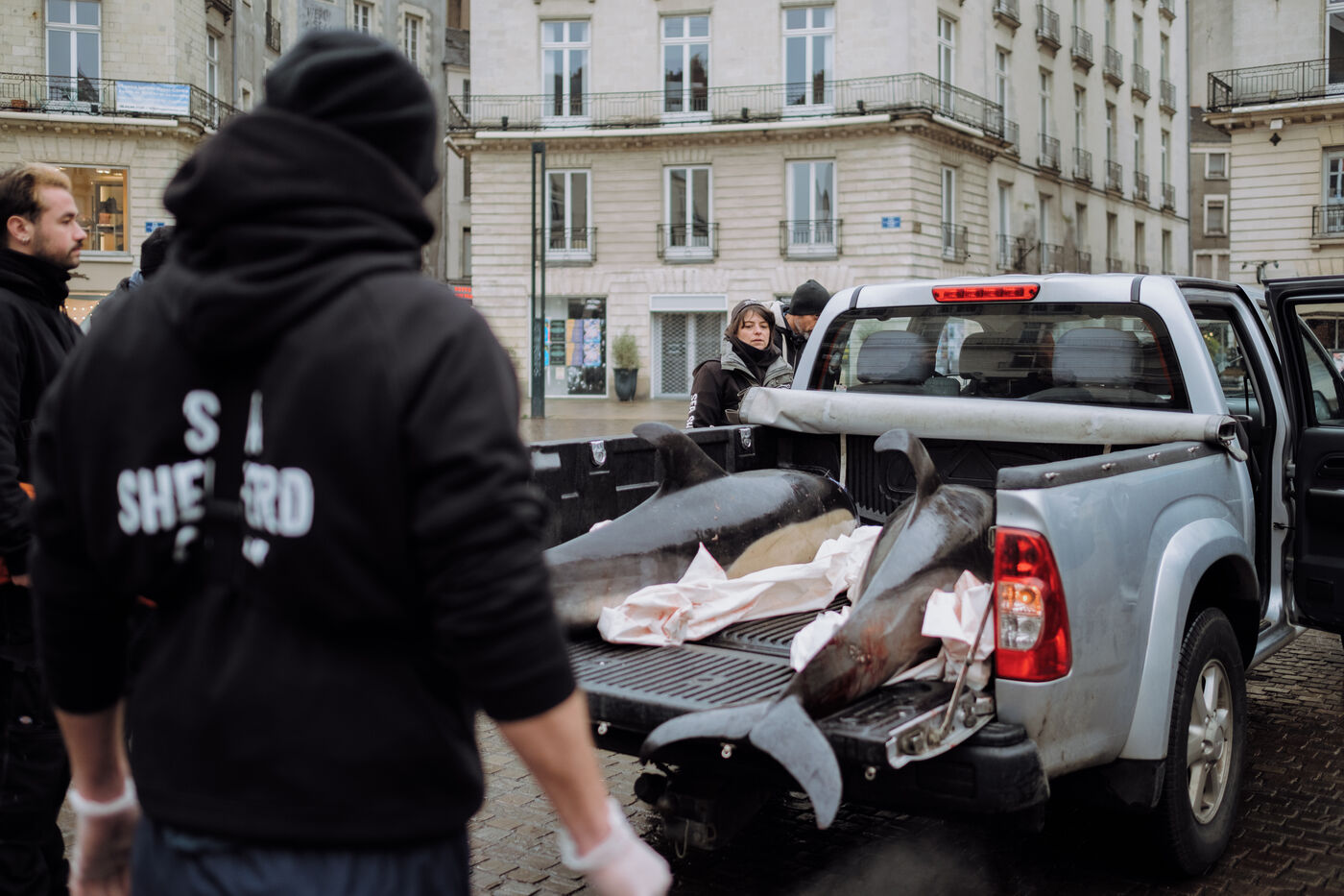 Des activistes de l'association Sea Shepherd France exposent les cadavres de deux dauphins trouvés la veille en mer, victimes de captures par des fileyeurs de 10 et 12 m au large des Sables d'Olonne. Caroline Roose, députée européenne, était à bord avec l'équipage de Sea Shepherd lors de la récupération des corps de ces dauphins, et est présente sur l'opération de sensibilisation.