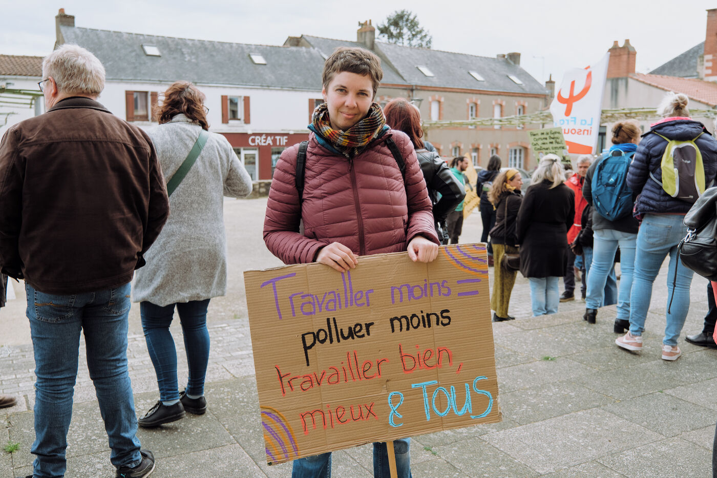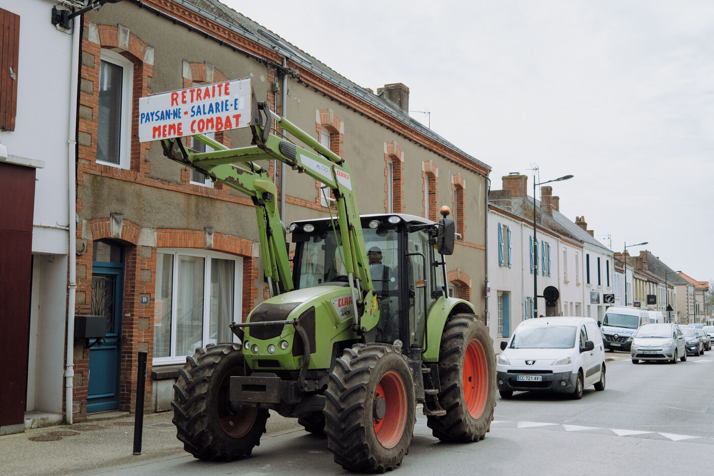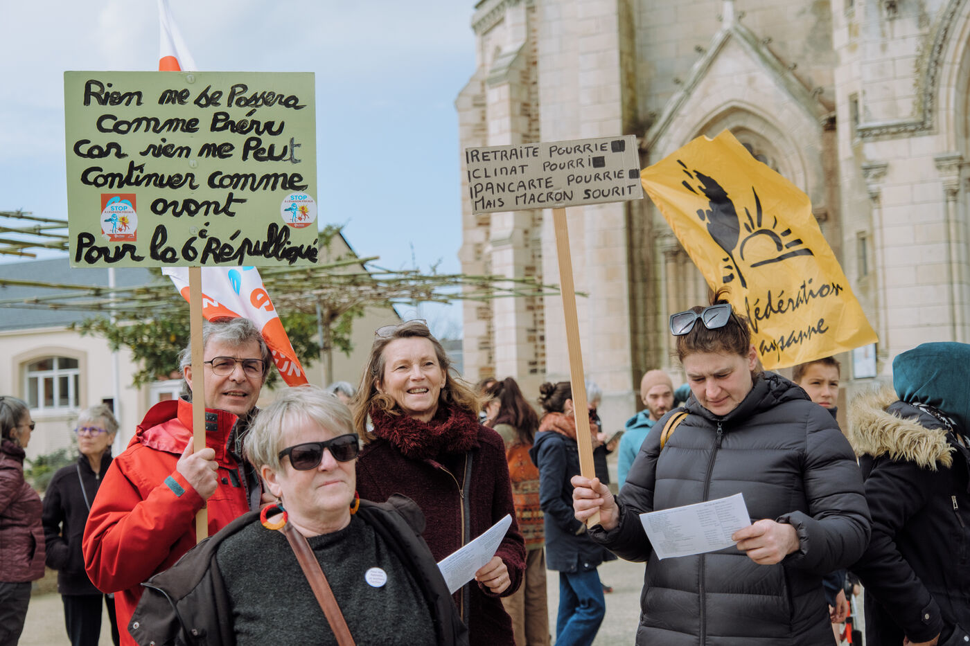 Tenth day of strike and demonstration against the pension reform, in the small rural town of Sainte-Pazanne, on March 28, 2023, in response to the joint call of the eight French trade union confederations of employees (CFDT, CGT, FO, Solidaires, FSU, CFTC, Unsa, CFE-CGC). For the first time since the beginning of the movement, more than 200 people gathered in this town, to be able to demonstrate locally and without violence.