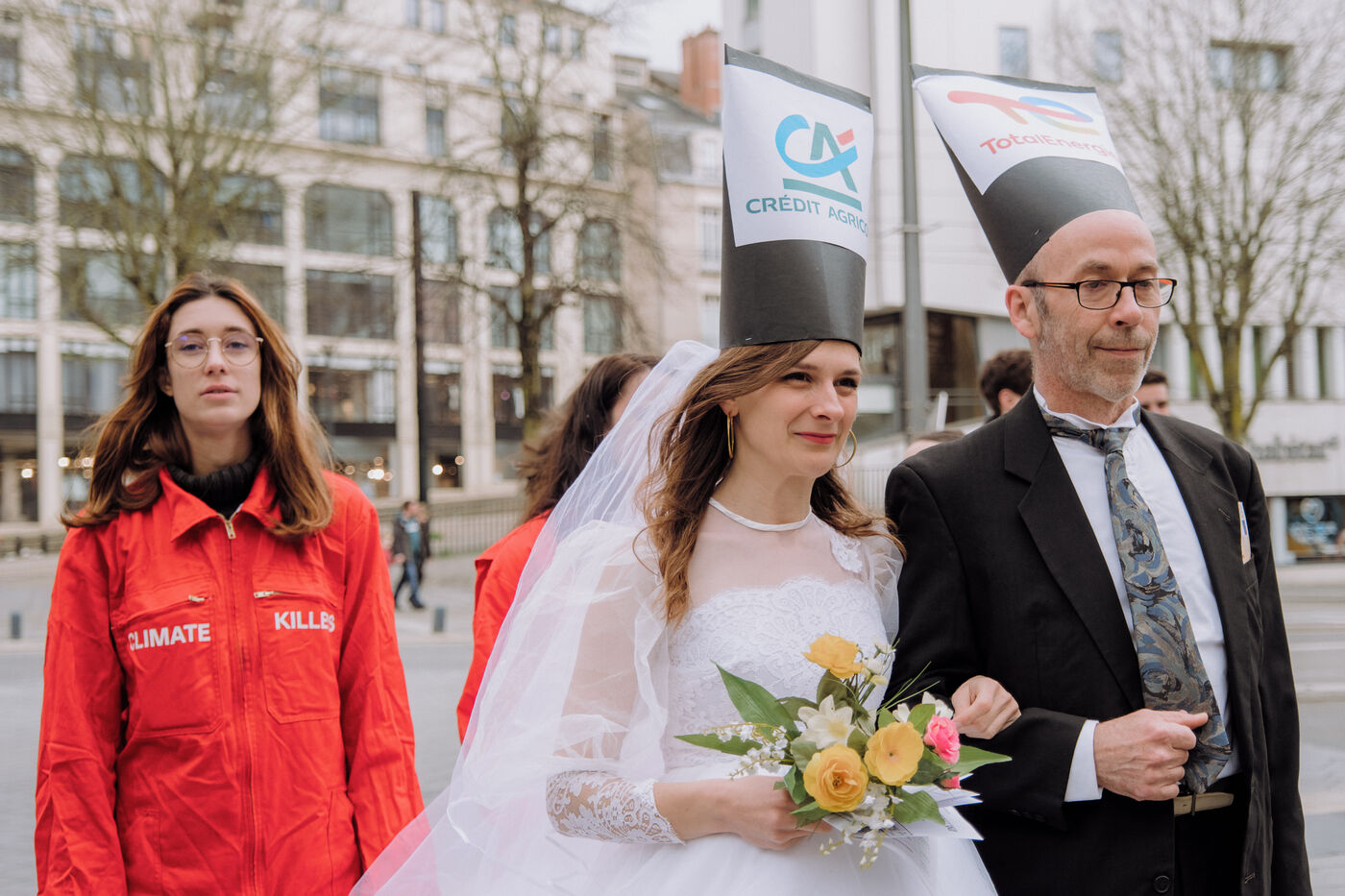 Climate activists parody a marriage between Total and Crédit Agricole